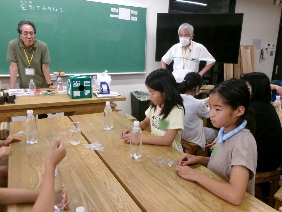 午後の部には、4~6年生の子どもたちが参加しました。ストロー鉄砲や段ボールの空気砲、ペットボトルの空気砲を作って的当てゲームをしたり、浮沈子を作ったりしました。