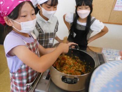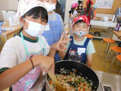 この日に申し込んだ子どもたちも班のメンバーと協力しながら、野菜の皮をむいたり、包丁で野菜を切ったり、材料を炒めたりする等の作業をがんばりました。