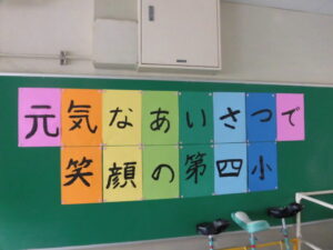 第四小学校だいよんしょうがっこうのめざすどもぞうなかにあいさつをすすんでするがあります。
