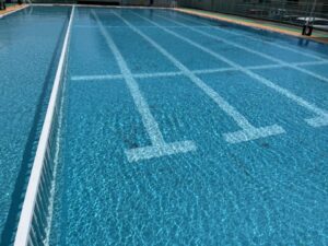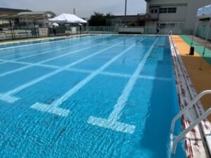 6年生がプール掃除をしてくれたおかげで、こんなにきれいです。底のラインもくっきりです。そして…