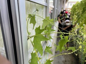ヘチマ自体も大きくなっていましたが、つるもどんどん伸びて、校長室に入ってきそうな勢いです。おかげで日差しを遮ってくれて涼しくなりました。