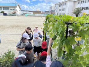 4年生がヘチマの観察をしていました。ずいぶん大きくなっていて、子どもたちも大喜びです。