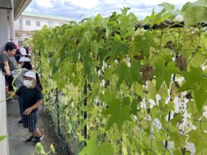 ヘチマ自体も大きくなっていましたが、つるもどんどん伸びて、校長室に入ってきそうな勢いです。おかげで日差しを遮ってくれて涼しくなりました。