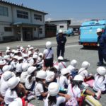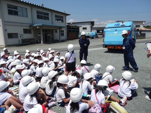 また,パッカー車体験も行いました。実際に家から持ってきたごみをパッカー車に投入し,ごみが積み込まれていく様子を間近で見ることができました。パッカー車を自由に見学したり,緊急停止ボタンを押してみたり,貴重な体験ができました。