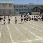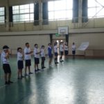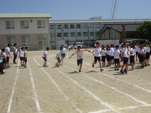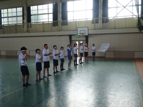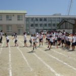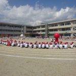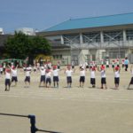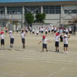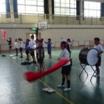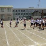 休み時間には運動場では通学団リレー、体育館では応援団が練習をしていました。応援団は朝の登校後も進んで活動しています。