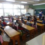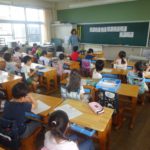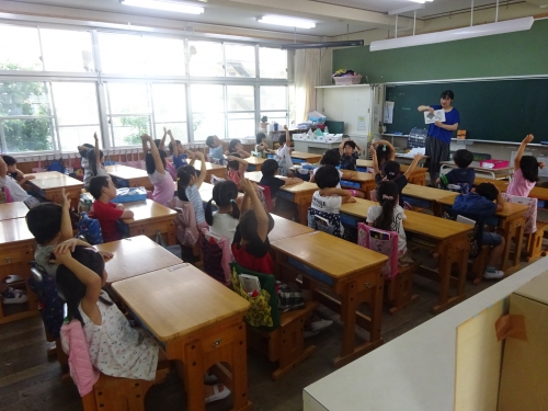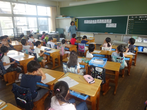 水曜日の朝はWednesday Englishです。8時20分に英語の音楽が流れます。今日はKatsuとOkaが夏休みの小話を放送室から英語でしてくれます。各教室では、話しの中で出てきたことのクイズが出されていました。1年生の教室でも一生懸命聞いていました。