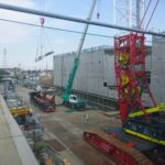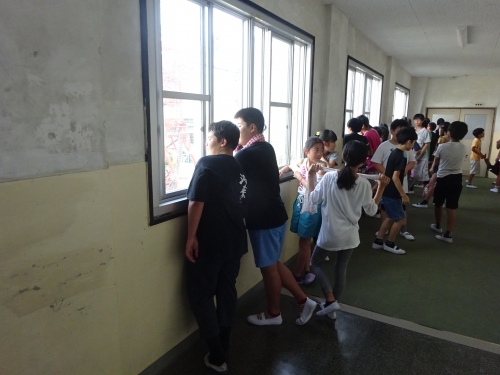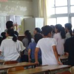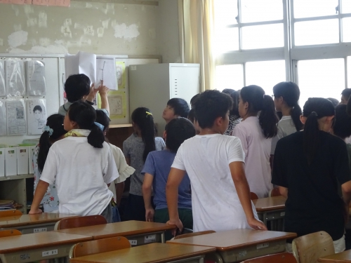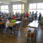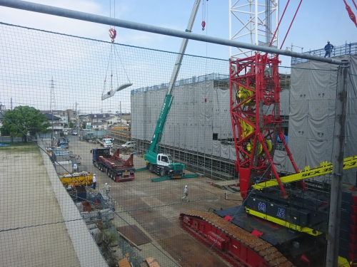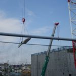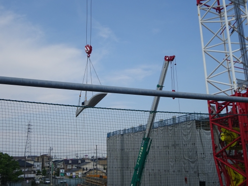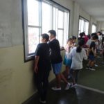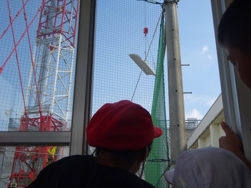 6年生が鎌田中学校の3階廊下から新校舎の工事の様子を見学させていただきました。今日から、屋上の教室の屋根に当たる部分をクレーンで持ち上げるという最新式の工事に入りました。アーム部分が約50mもある大型のクレーンです。工事の様子を見学させていただいた後、北村組の方に工事の説明をしていただきました。子どもたちの見学の時間に合わせて、クレーンの作動をしていただく等、北村組さんと鎌中さんにはお世話をおかけしました。ありがとうございました。6年生のみんなは、新校舎の新入生にふさわしい学年です。頑張ってくれることでしょう。