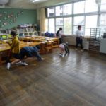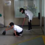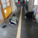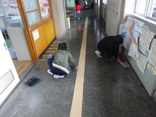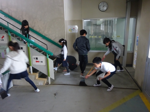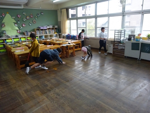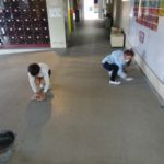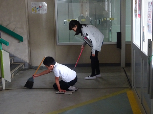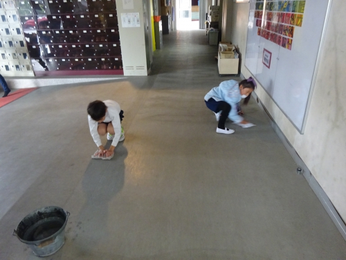 今日は雨のため、ロング休憩はなくなり、通常の掃除となりました。掃除の時間はにっこり班で行います。6年生の班長さんを中心に役割が分担されます。1階の掃除の様子です。雑巾での水拭きをとても頑張ってくれています。黙々と拭き掃除をする姿はいつも感心します。