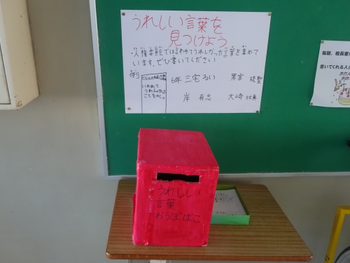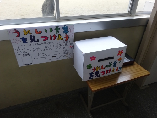 第一昇降口の所に人権委員会が作ったポストが設置されています。人権委員会では言われて嬉しかった言葉を募集しています。ポストに投函してもらい、全校のみんなに広めてもらいます。それぞれの委員会で、学校がより良くなるように、楽しくなるようにと工夫した取組をしてくれています。