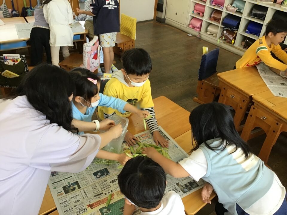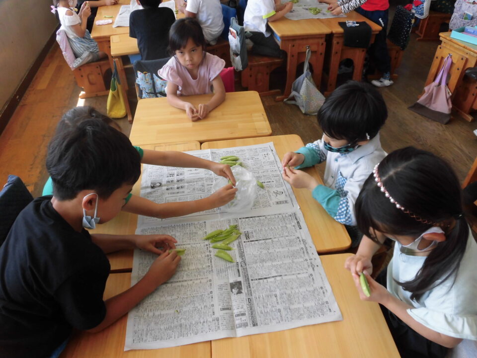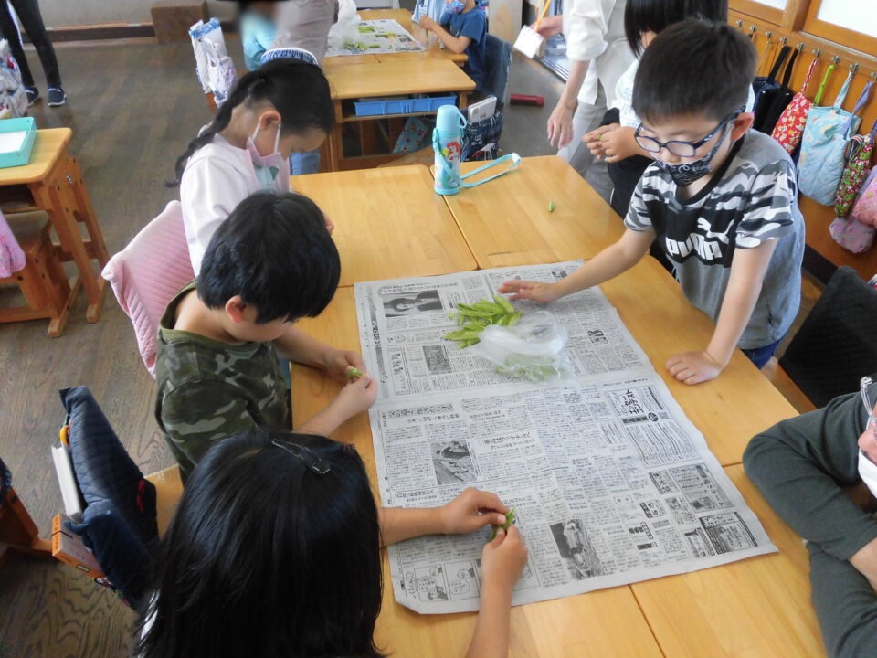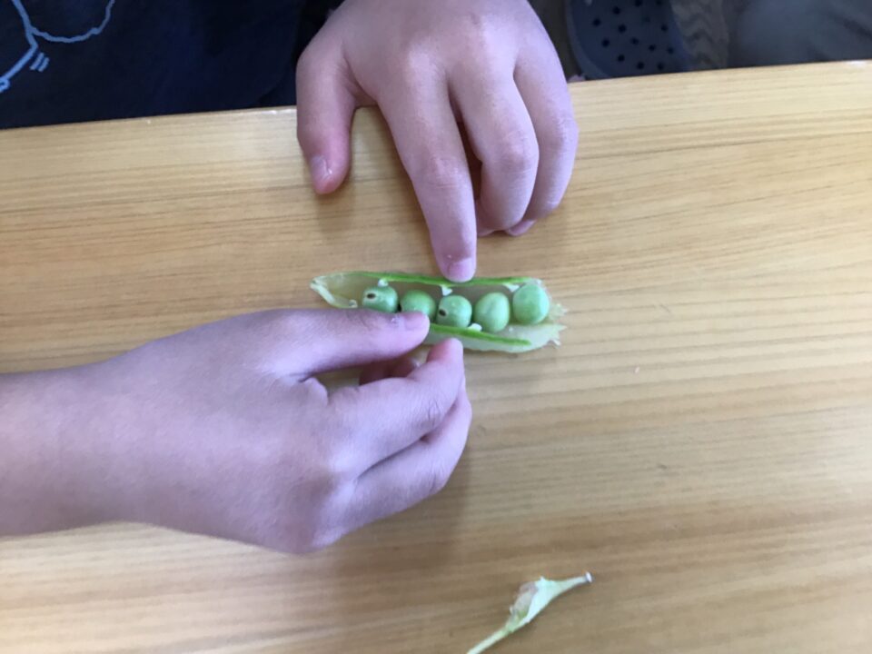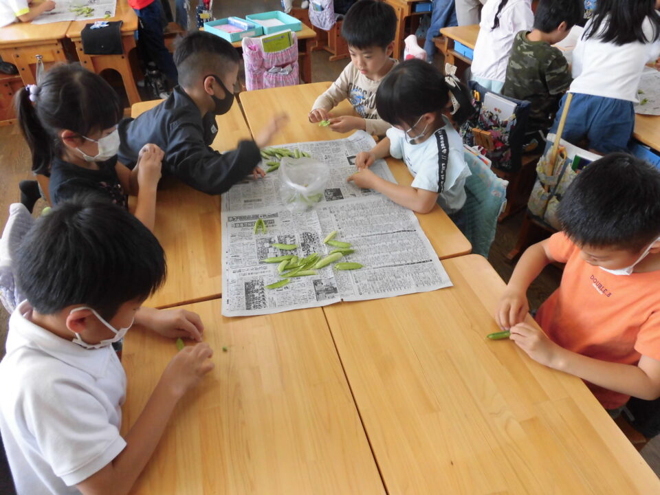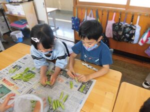 よ~~~く観察をしたら、そのあとは明日の給食のために実えんどうのさやから豆を出す作業をしてもらいました。
