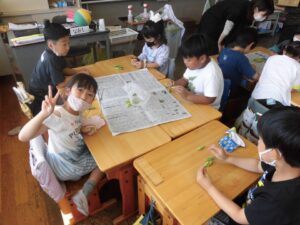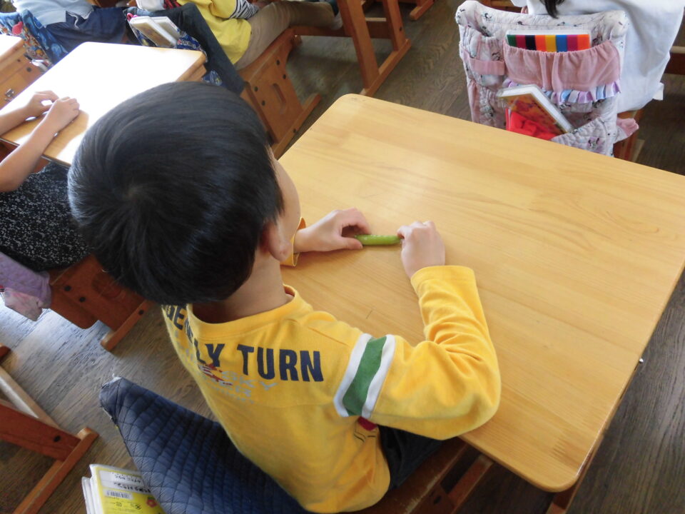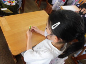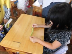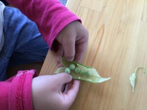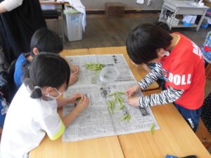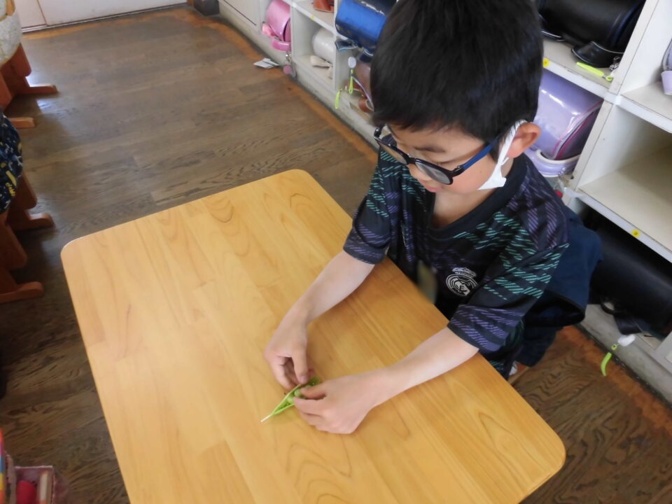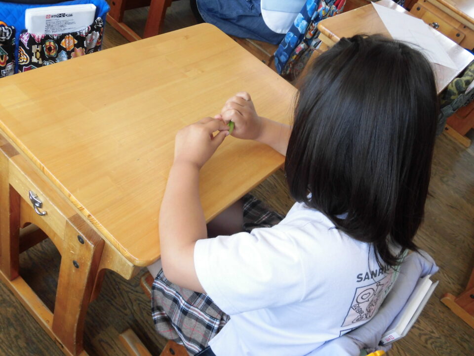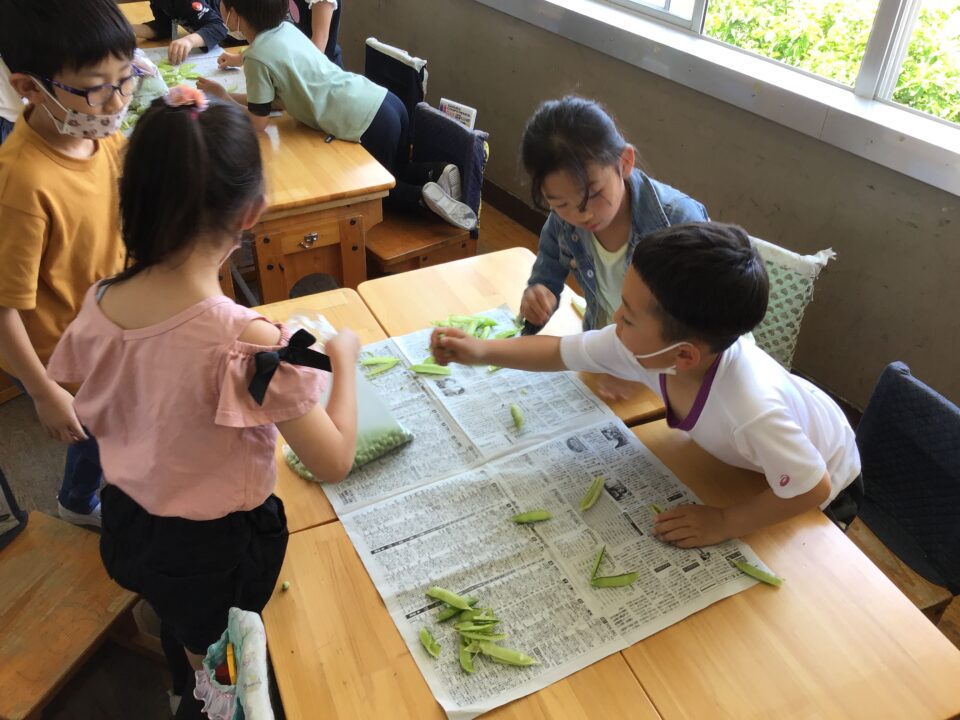 よ~~~く観察をしたら、そのあとは明日の給食のために実えんどうのさやから豆を出す作業をしてもらいました。