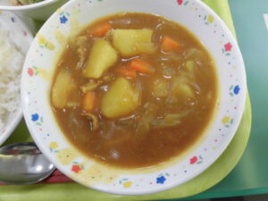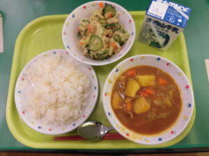 今日の給食は、ご飯(麦入り)、ポークカレー、牛乳、
