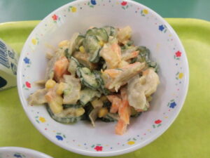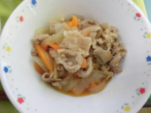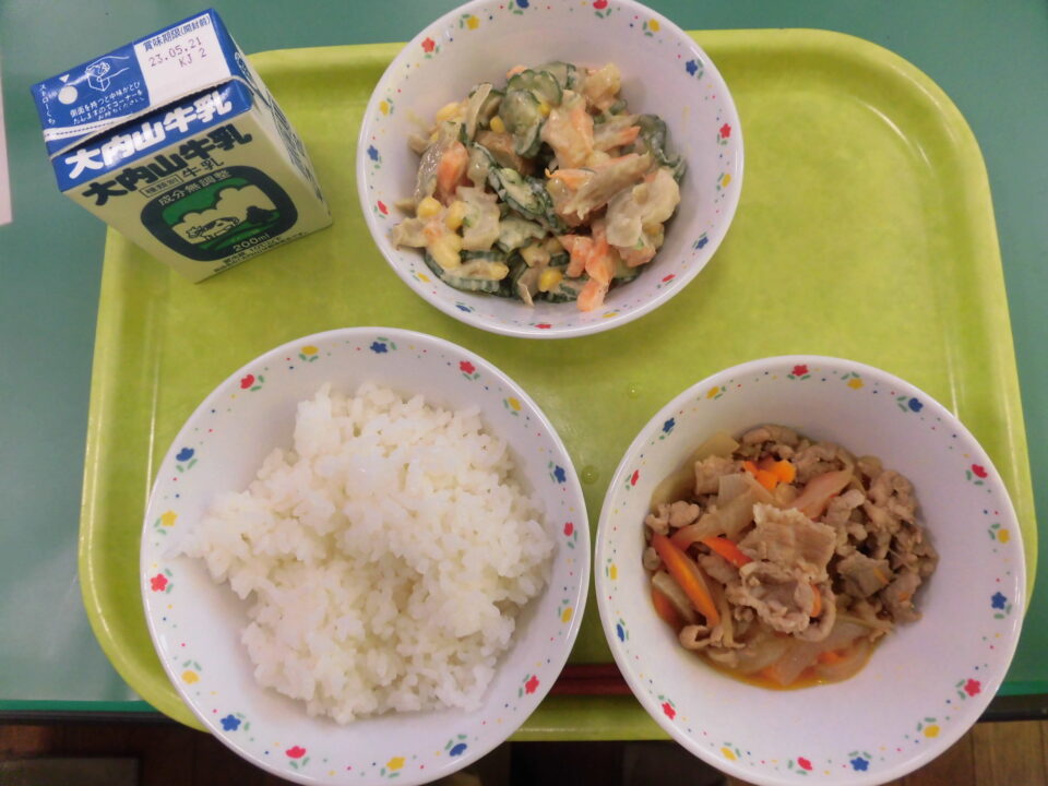 今日の給食は、ご飯、牛乳、豚肉と玉ねぎのしょうが炒め、ごぼうサラダでした。