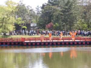 ここは、学校単位でまとまって入場しないといけないので、並びなおしです。待っている間、太鼓や雅楽の音が聞こえていたのですが、鏡池のところに舞台が設営されていて舞をしていました。