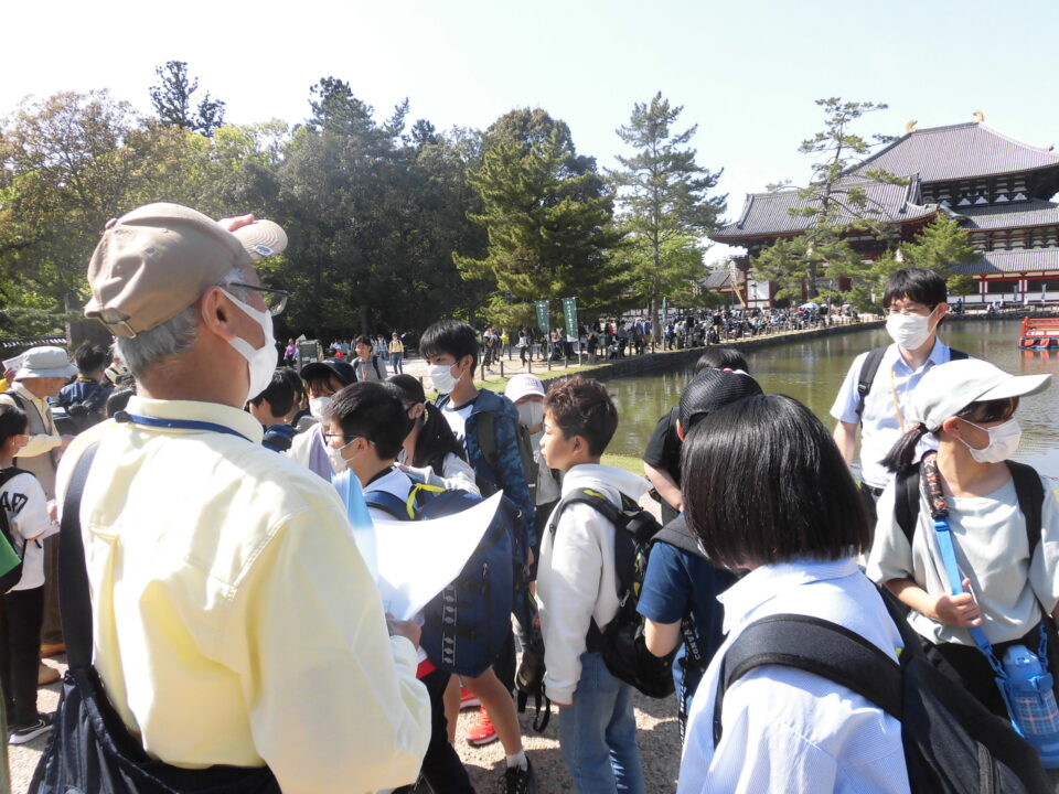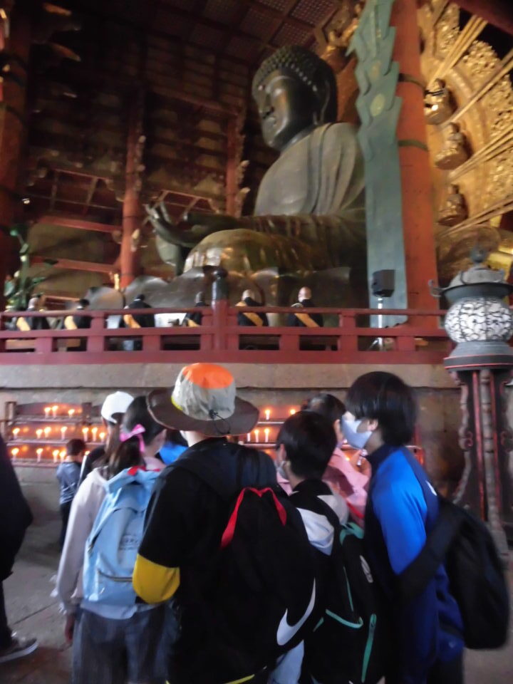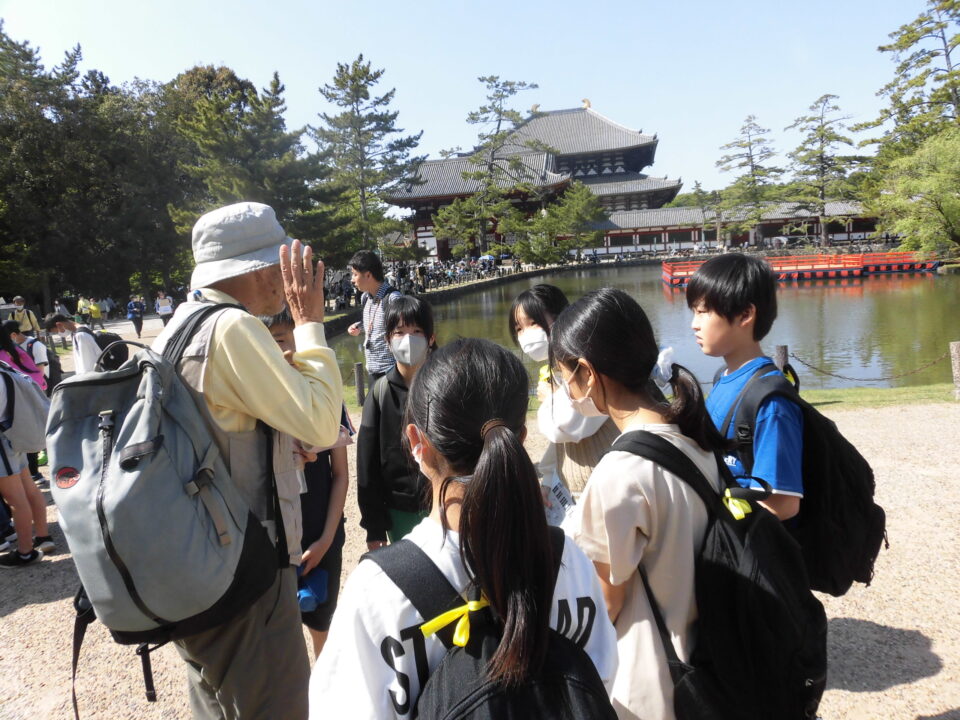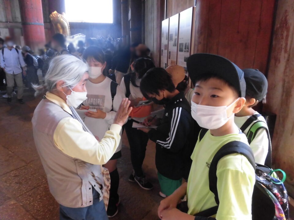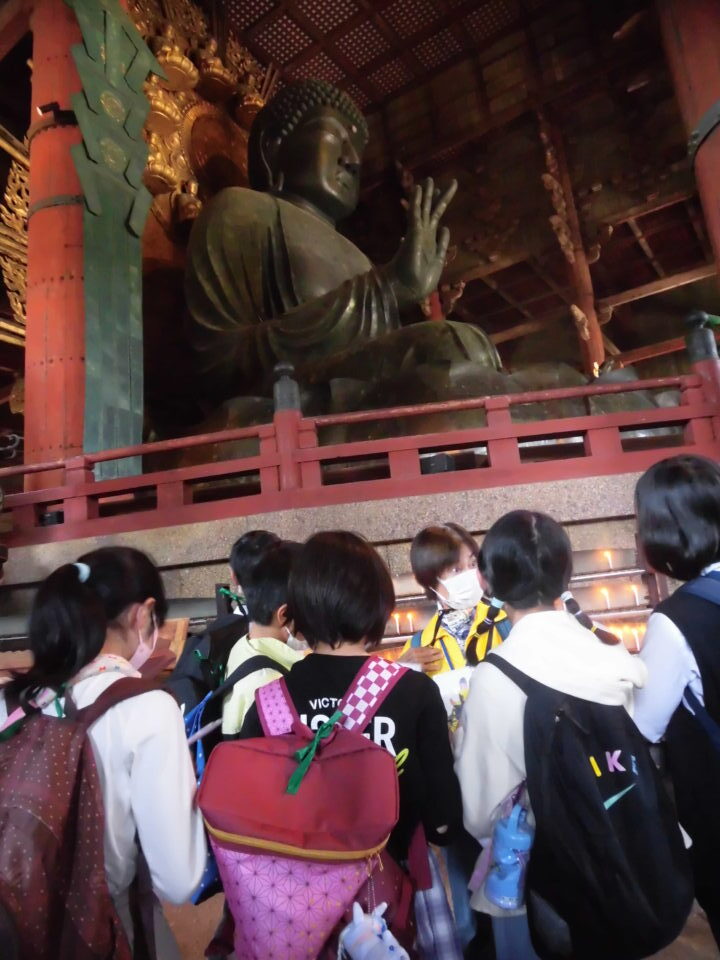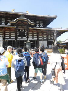 子どもたちは、大仏殿の大きさを実感し、見上げながら説明を聞いていました。