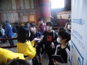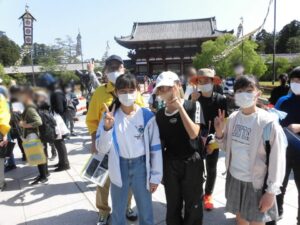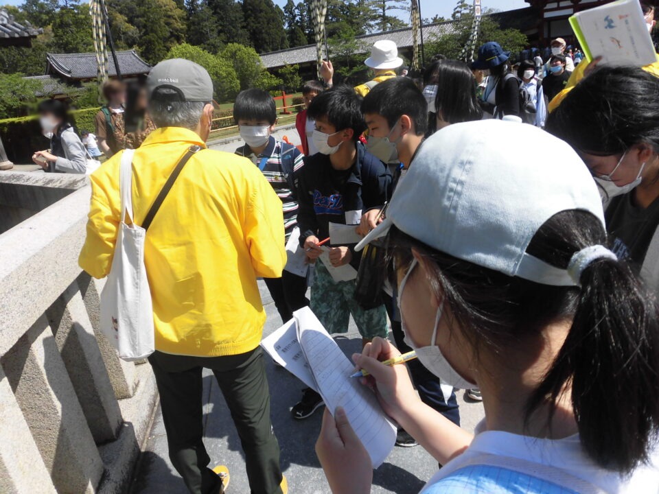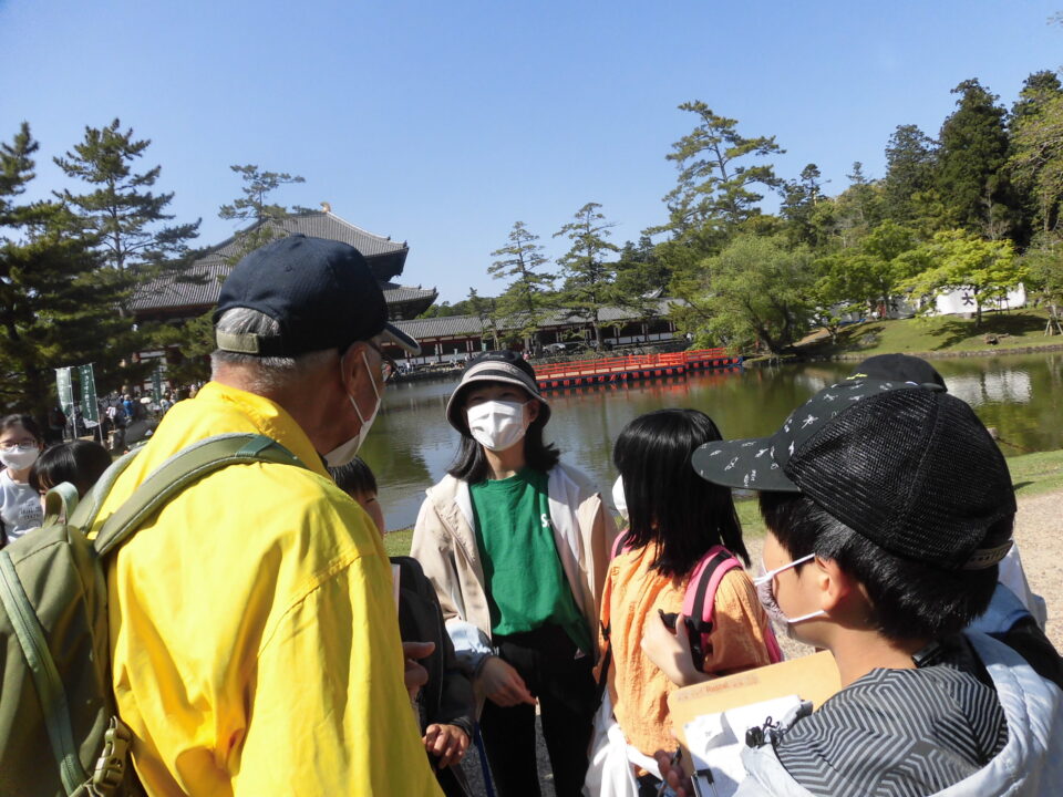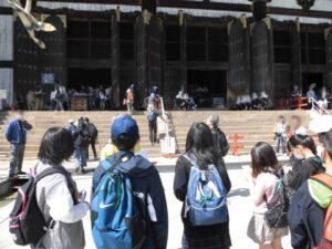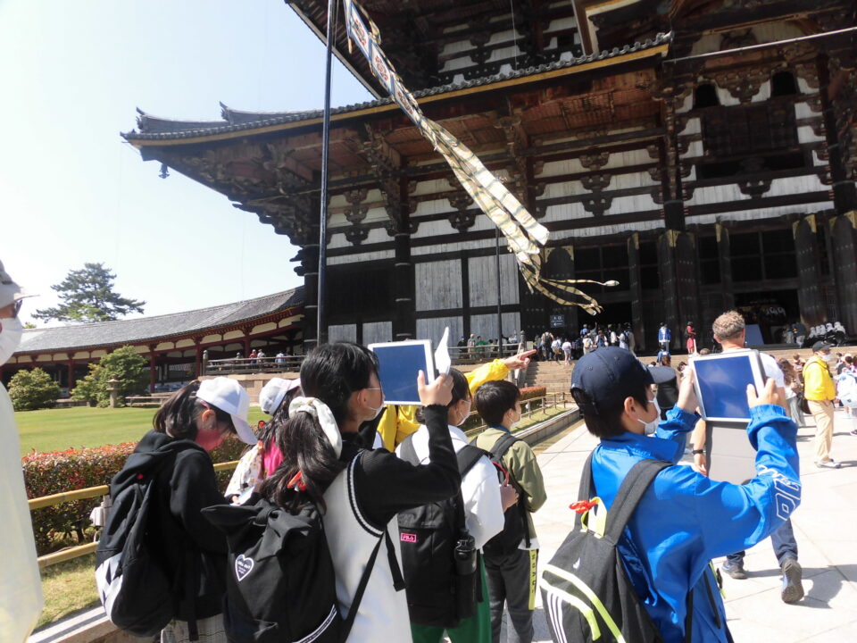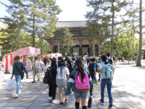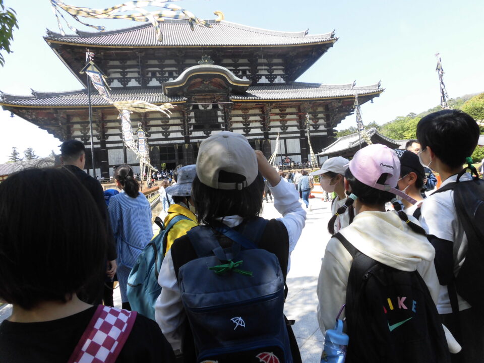 子どもたちは、大仏殿の大きさを実感し、見上げながら説明を聞いていました。