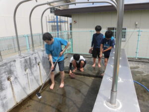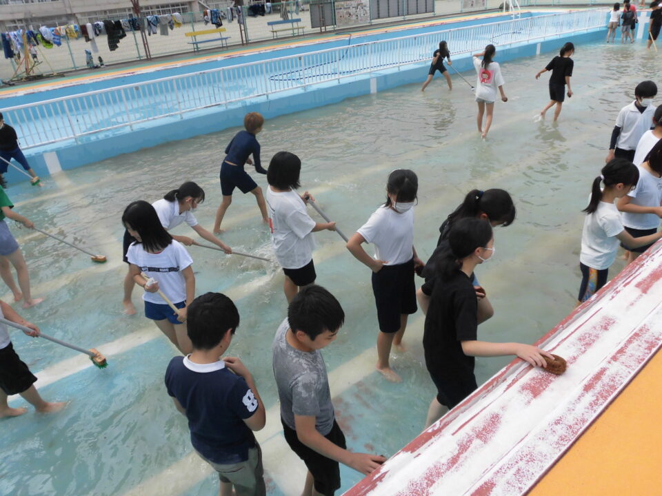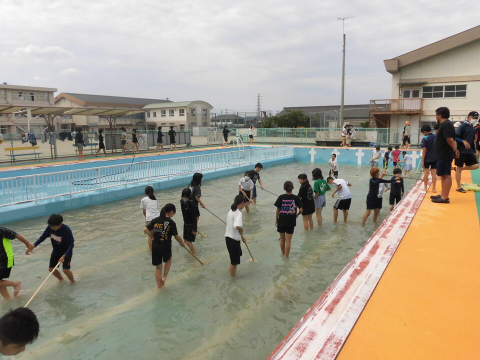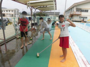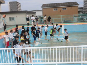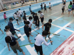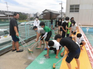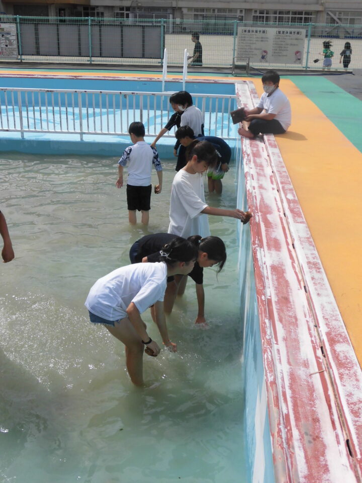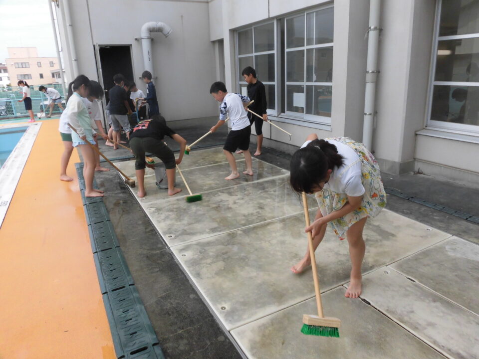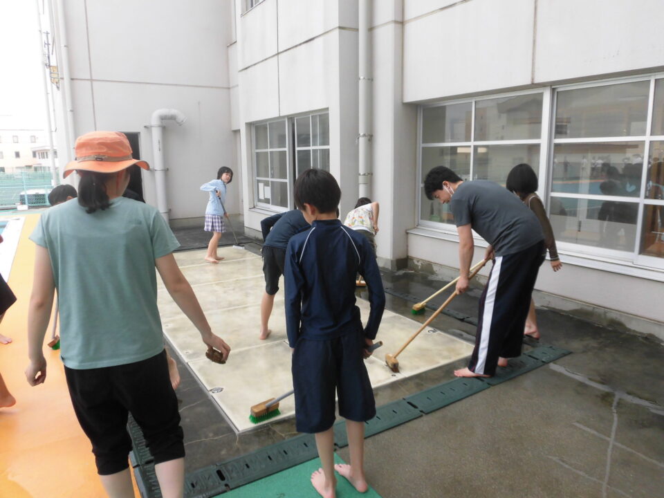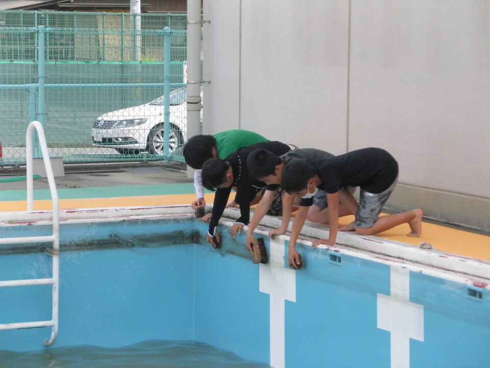 そのために、今日は午後から6年生の子たちがプール掃除をしました。