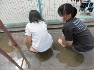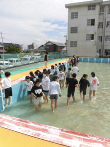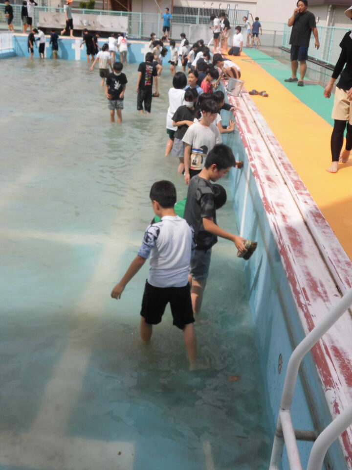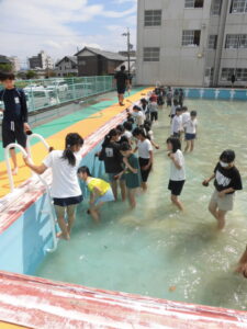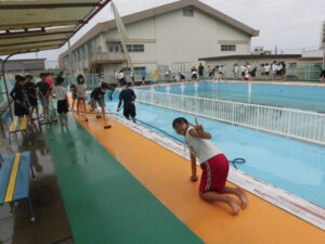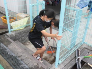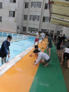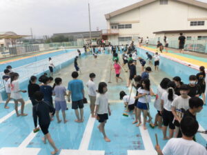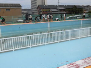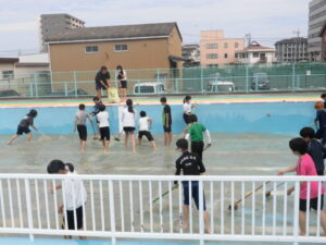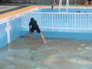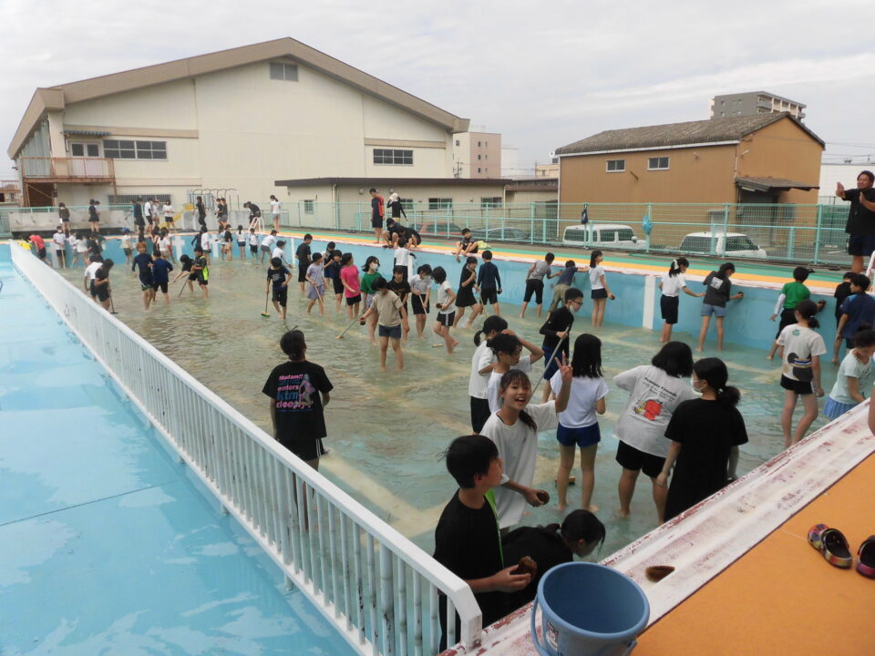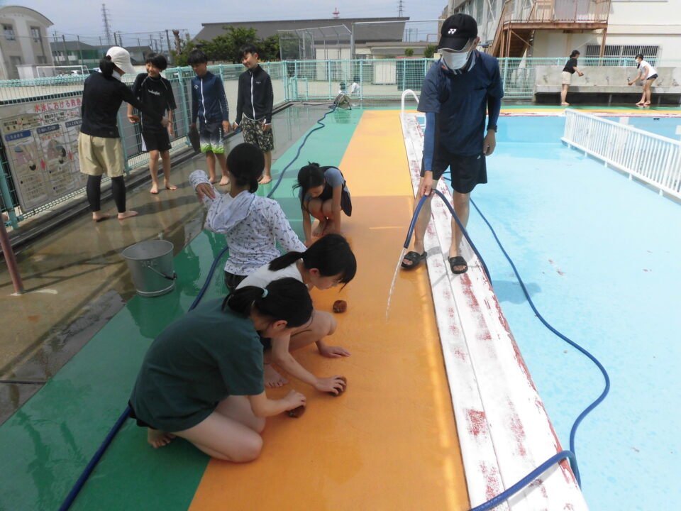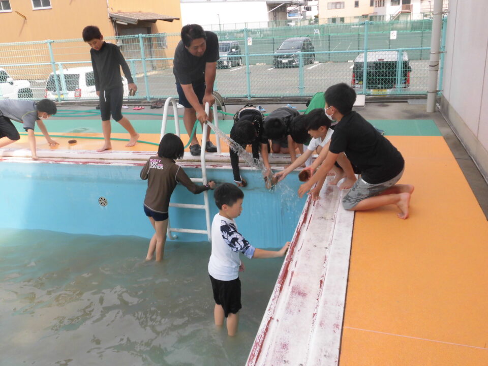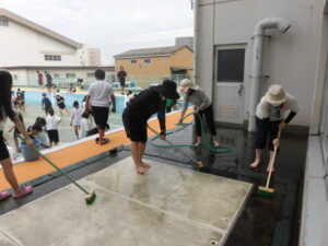 最後に、みんなで中へ入り、壁やプールの底をきれいに磨いてくれました。鎌田幼稚園の先生方もお助けに来てくれました。