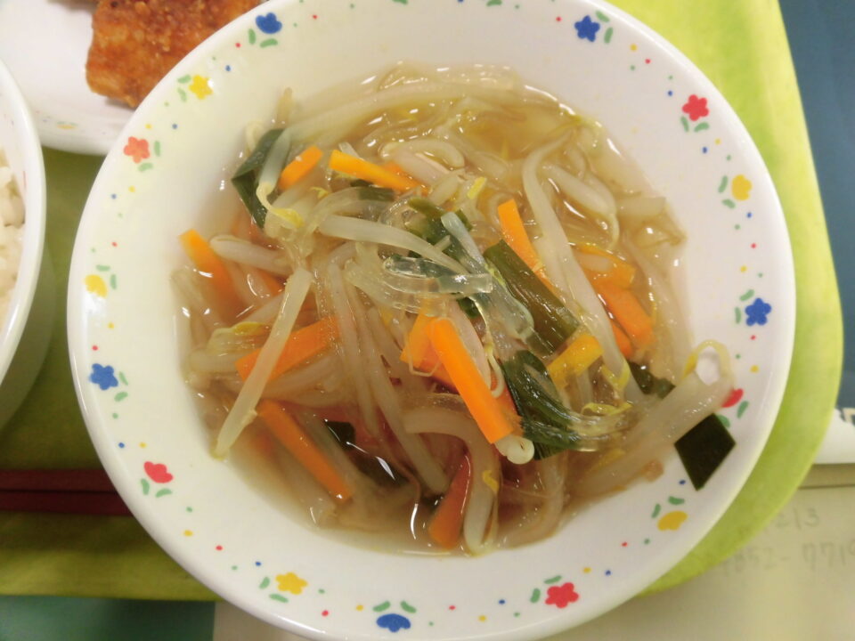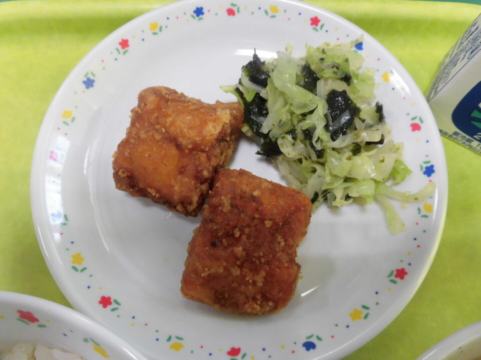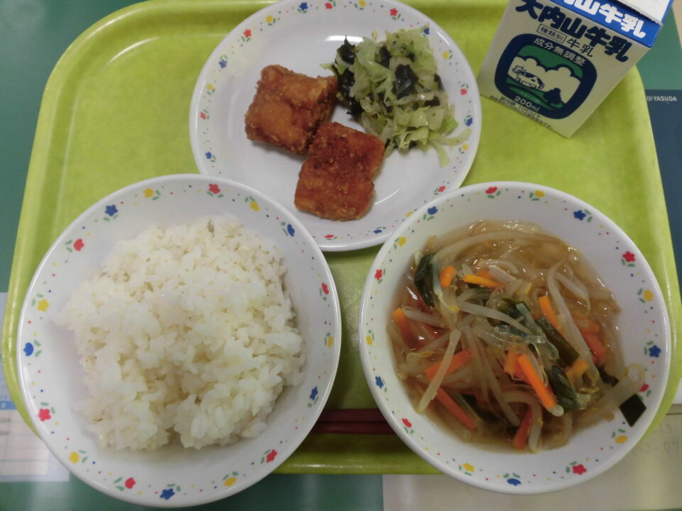今日の給食は、ご飯(麦入り)、牛乳、いかのかりん揚げ、キャベツのいそ和え、春雨スープでした。
