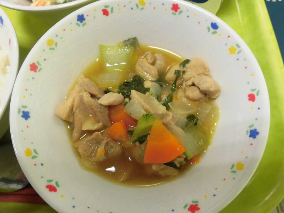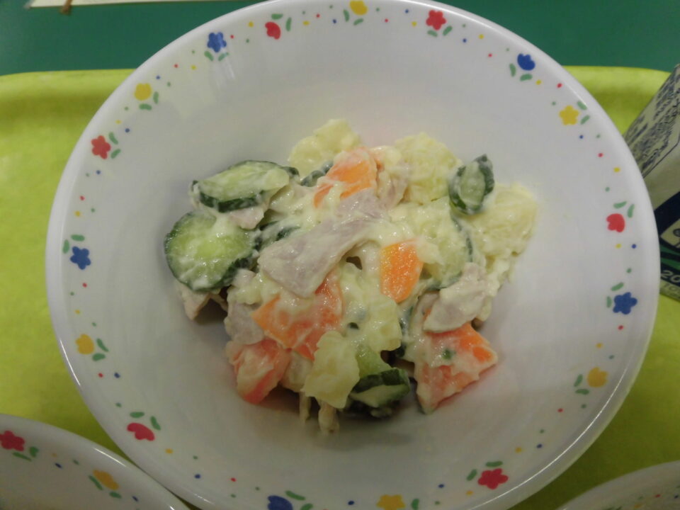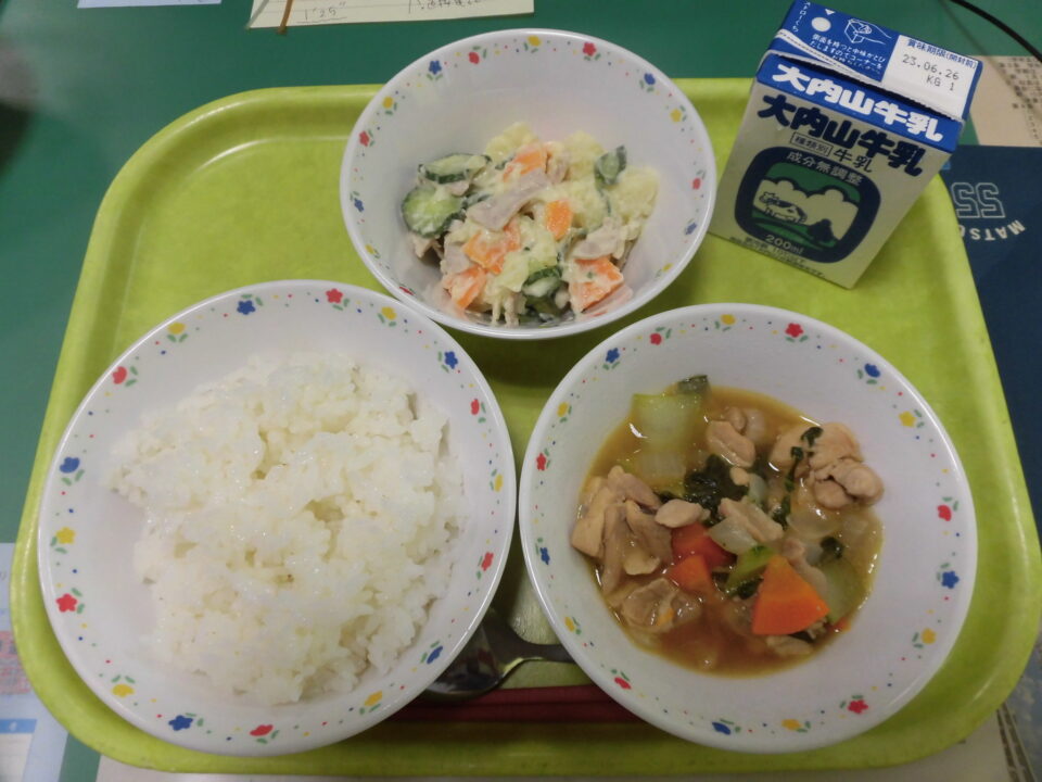 今日の給食は、ご飯、牛乳、チキンアドボ、ポテトサラダでした。