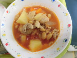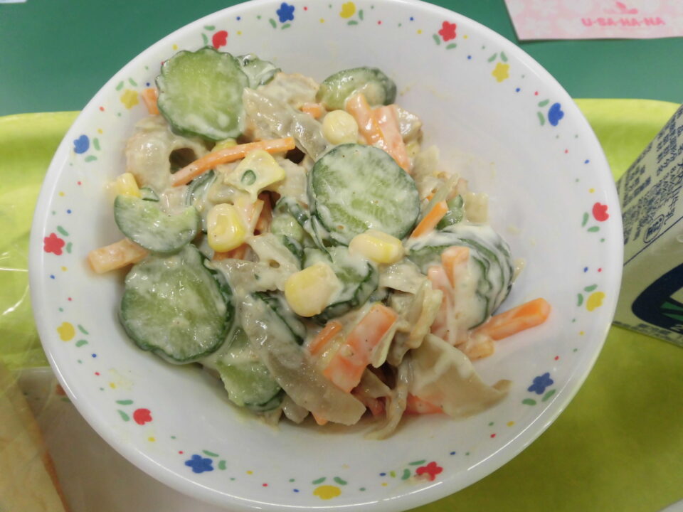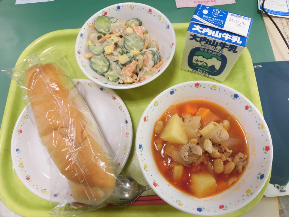米粉入りパン、牛乳、ポークビーンズ、ごぼうサラダでした。
