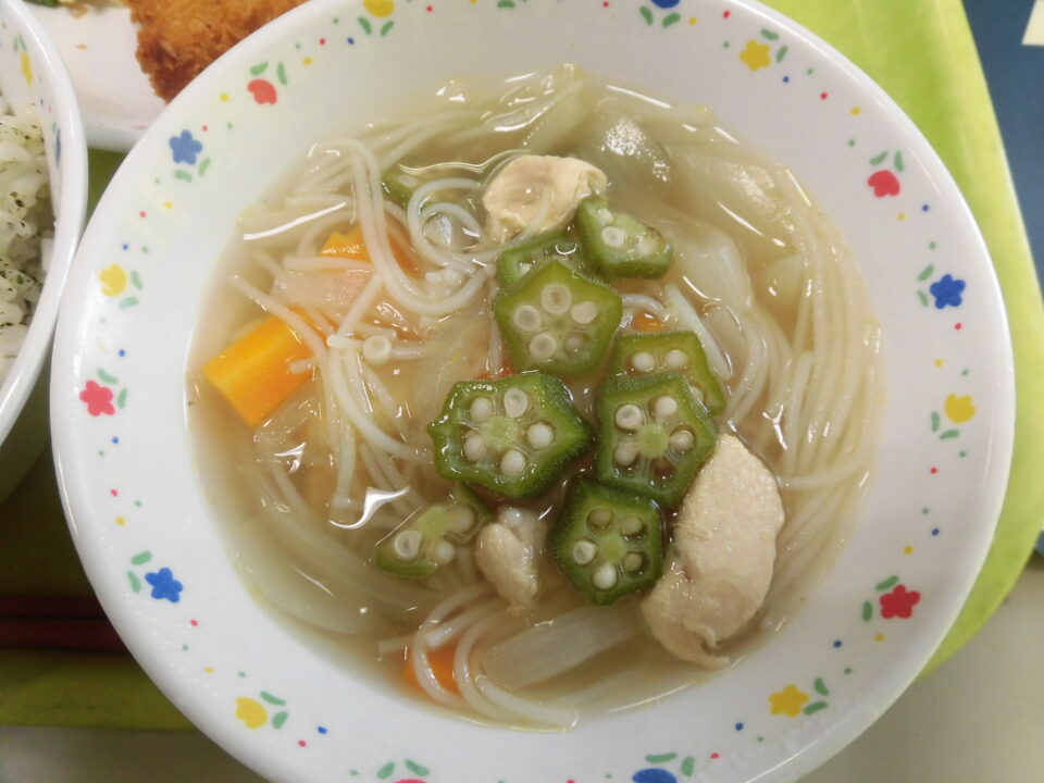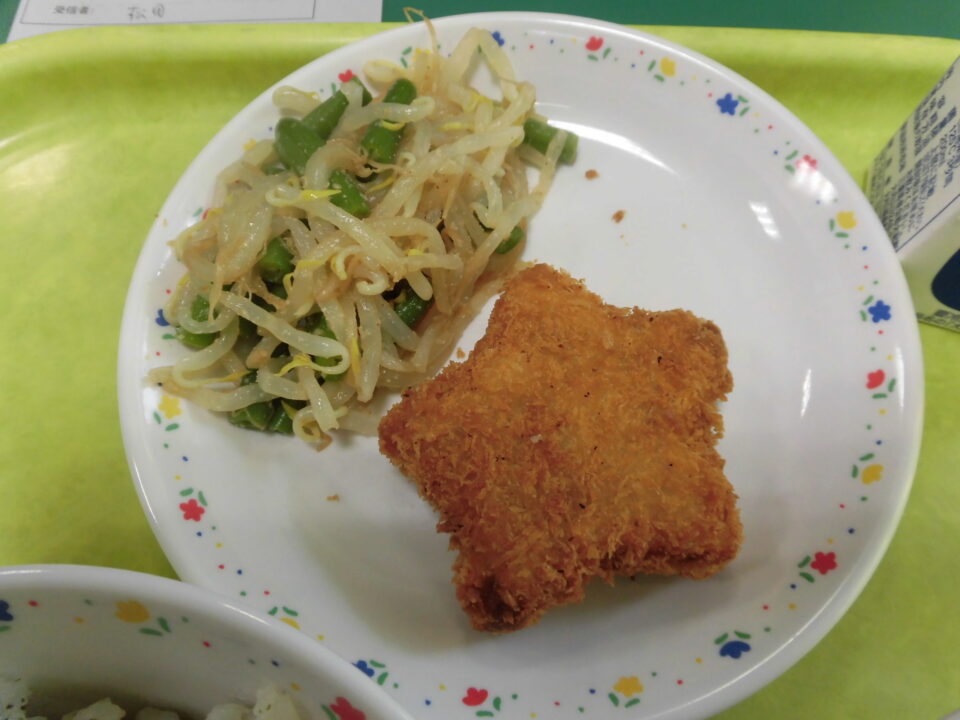 青じそご飯、牛乳、星形コロッケ、さやいんげんのごま和え、七夕汁でした。星形が多かったですね。