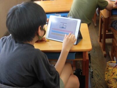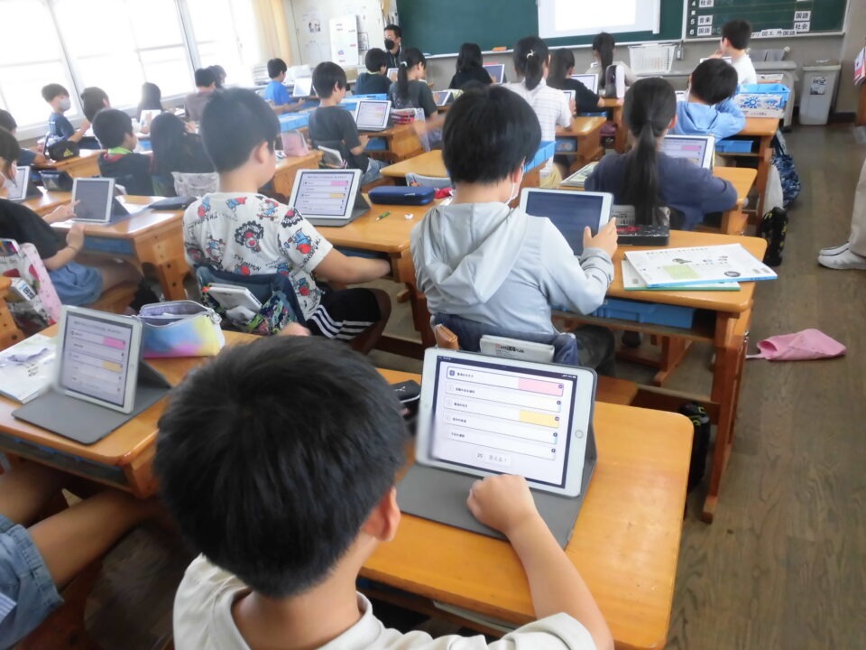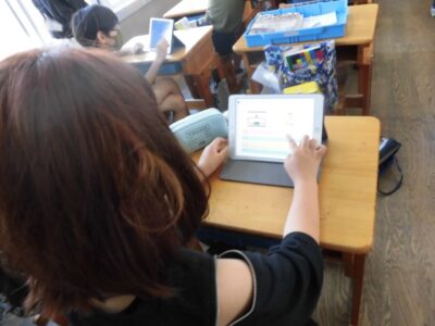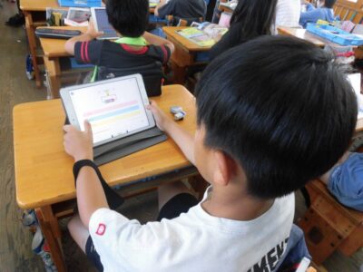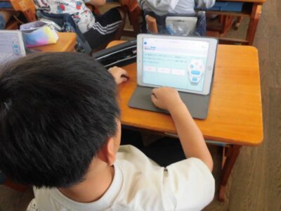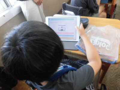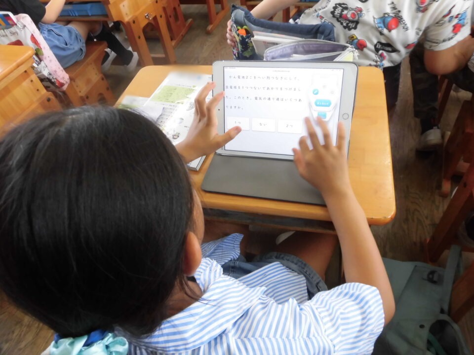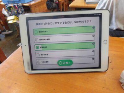 タブレット端末を利用して、担当の先生が作った「電気のはたらき」の問題を解いていました。時間も計測されるので、子どもたちは夢中になって取り組んでいました。このあとテストがあるので、もう1度タブレットで問題に取り組んだり、教科書を読んだりと、自分に合わせたテスト前学習をしていました。