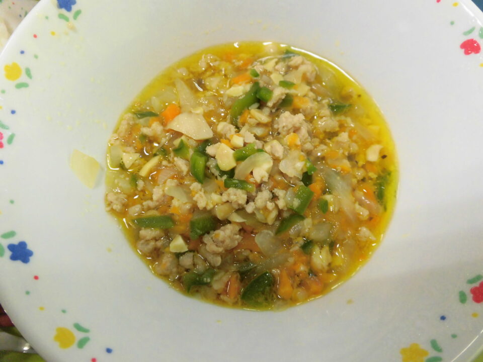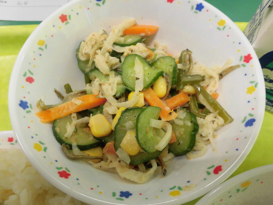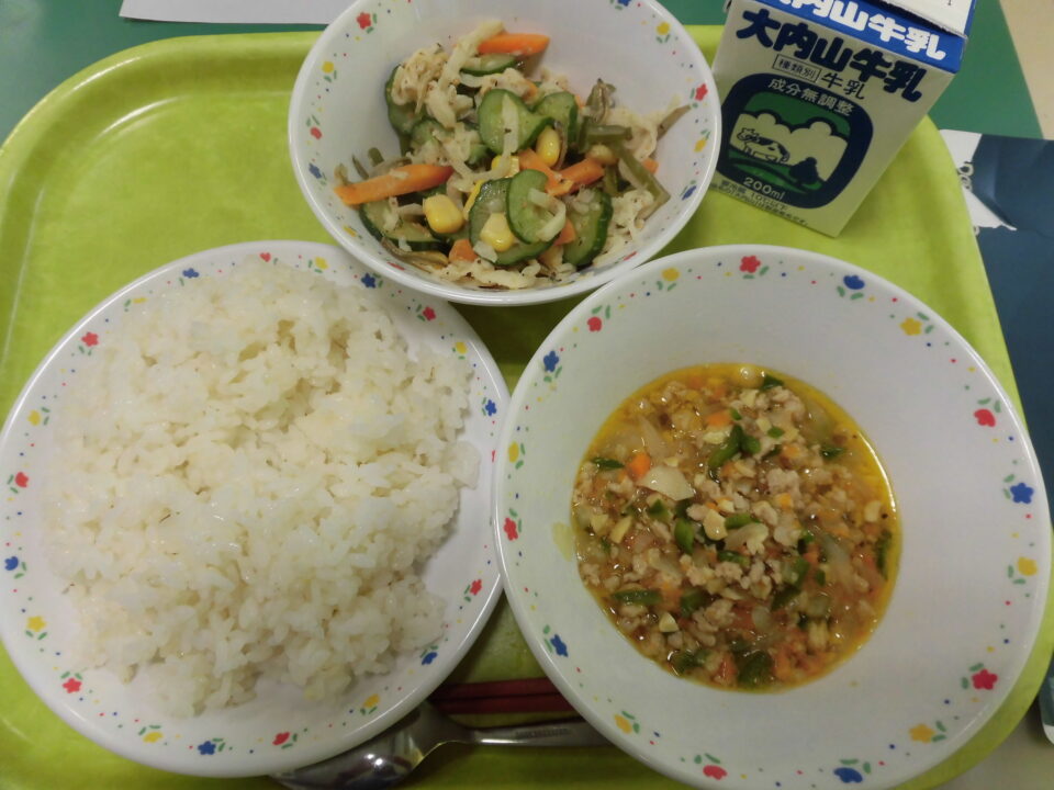 今日の給食は、ご飯(麦入り)、ガパオライスの具、牛乳、切干大根と小魚のサラダでした。