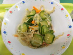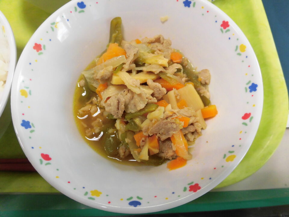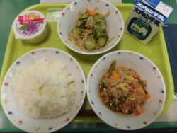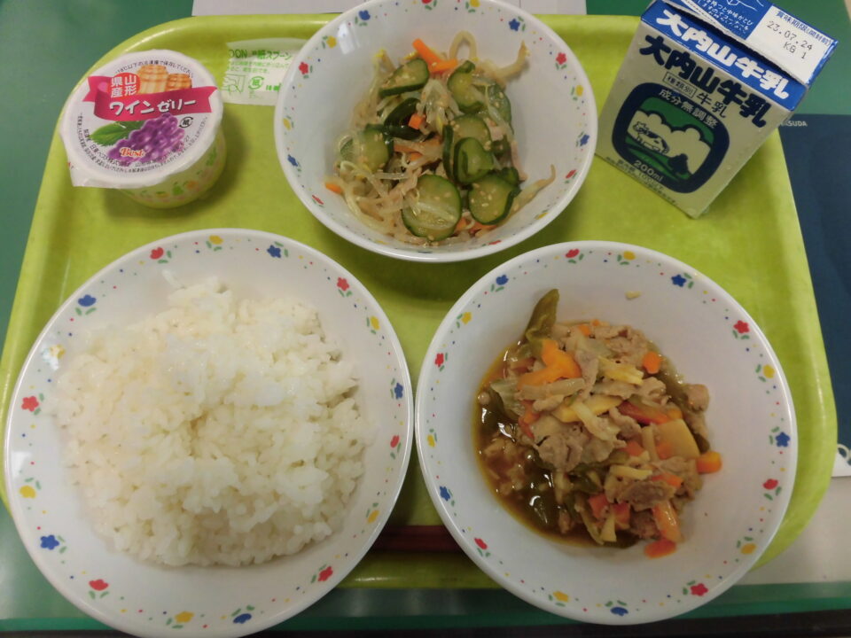 ご飯、牛乳、豚肉とピーマンのオイスターソース炒め、バンサンスー、ワインゼリーでした。