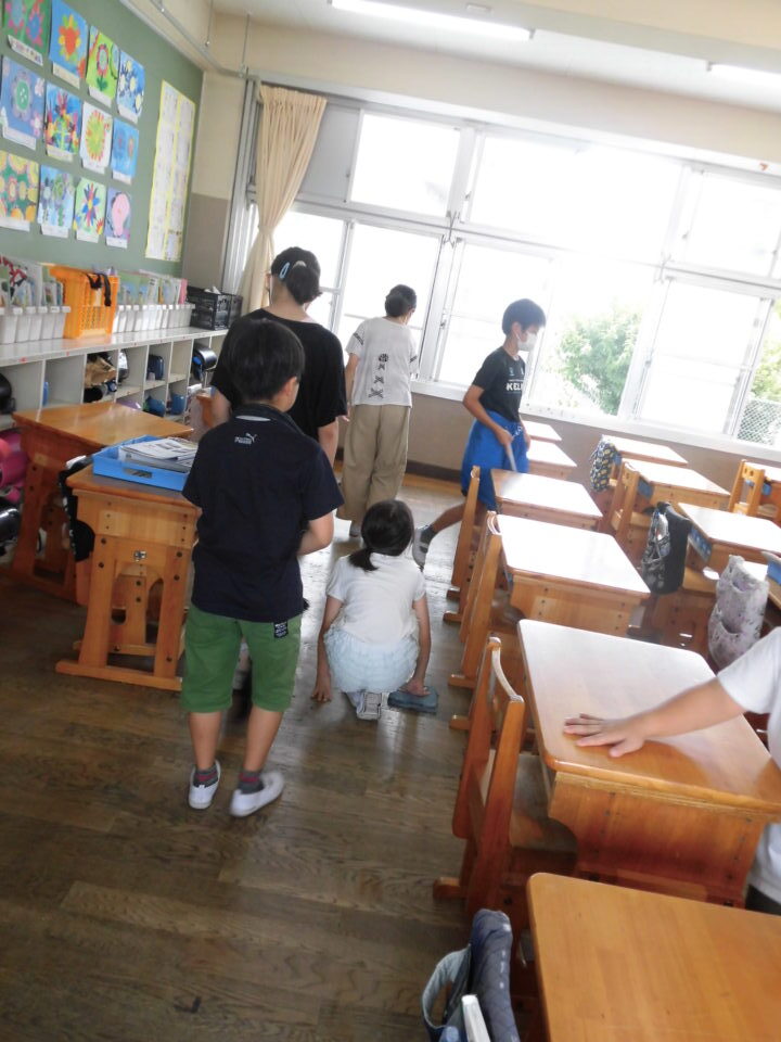 まず、学級掃除をしました。自分の机や椅子、ロッカーなどをきれいにしました。