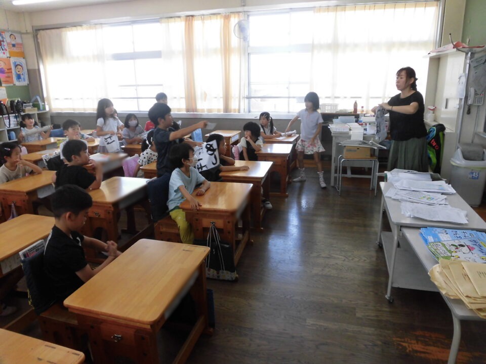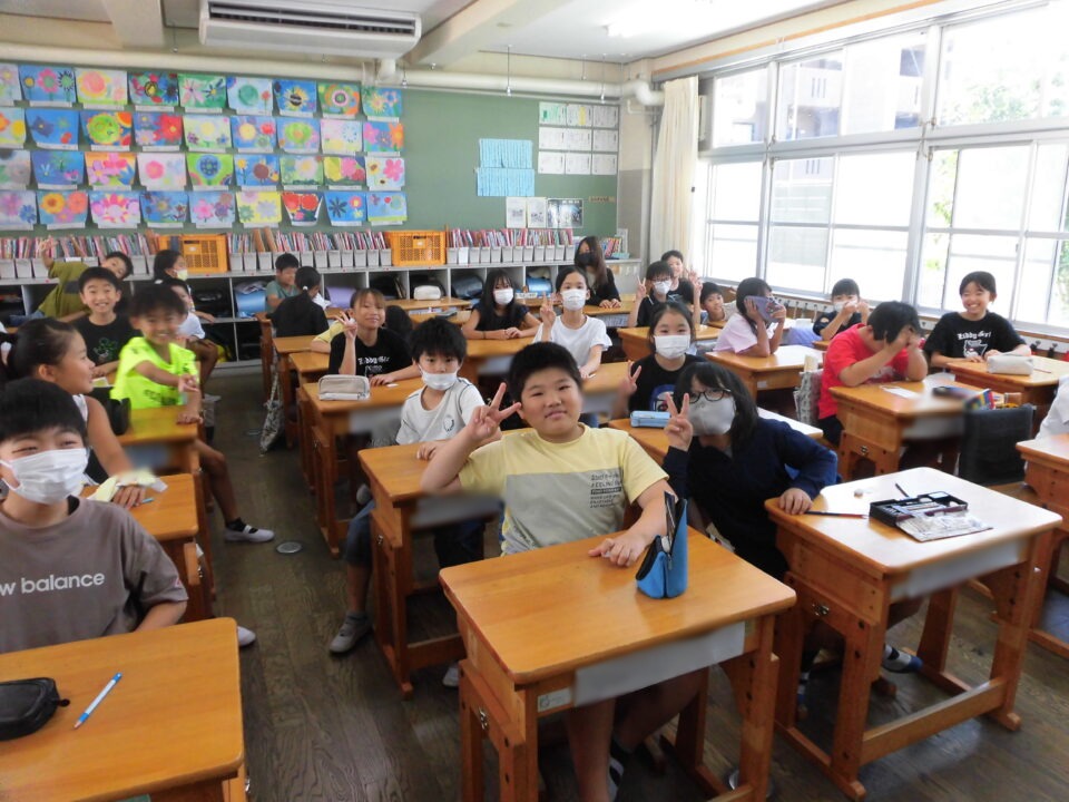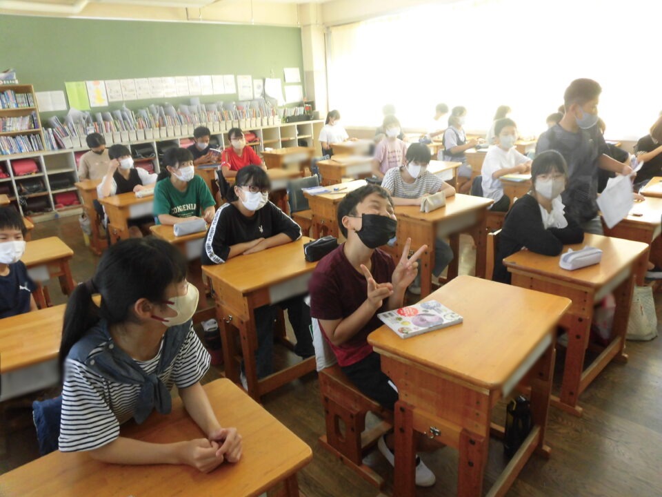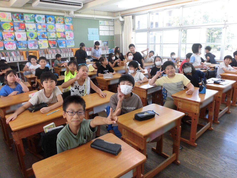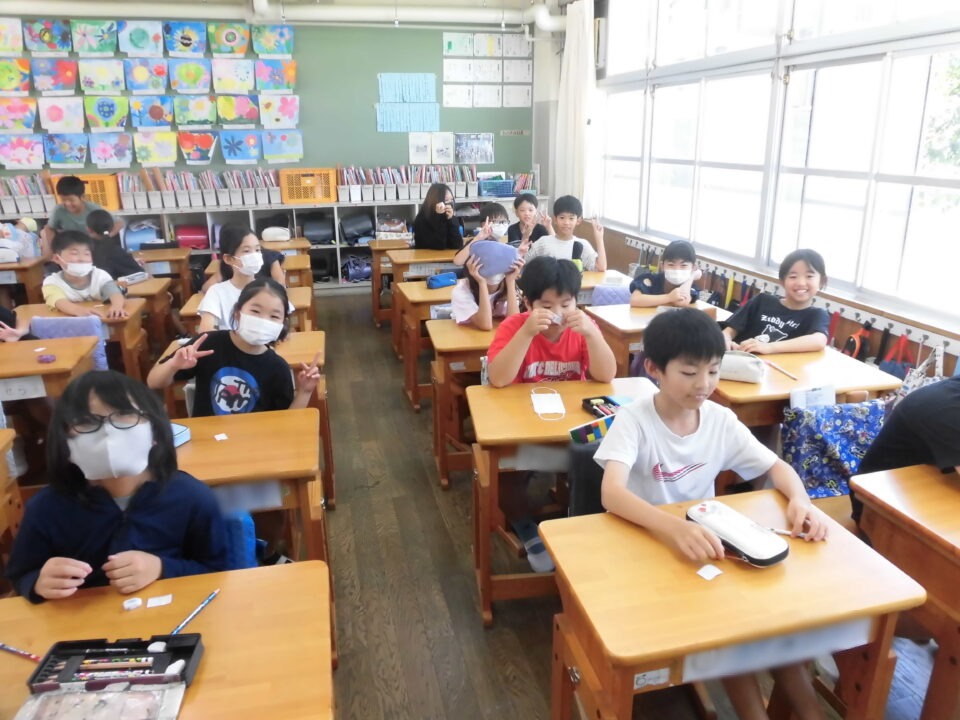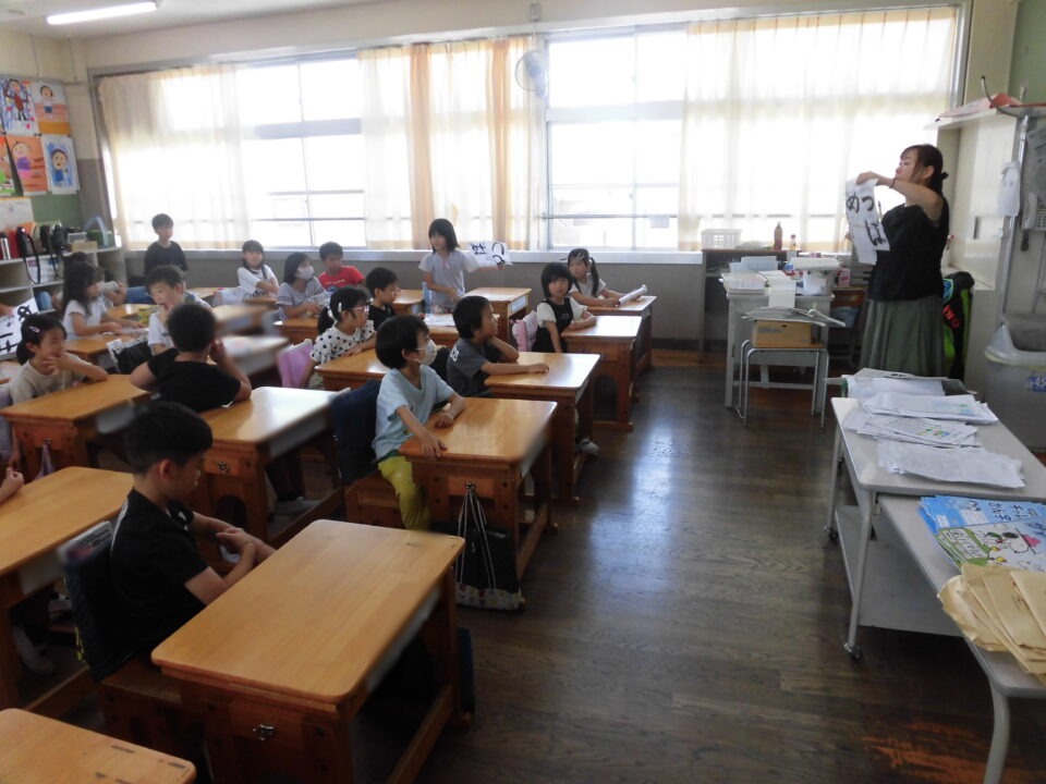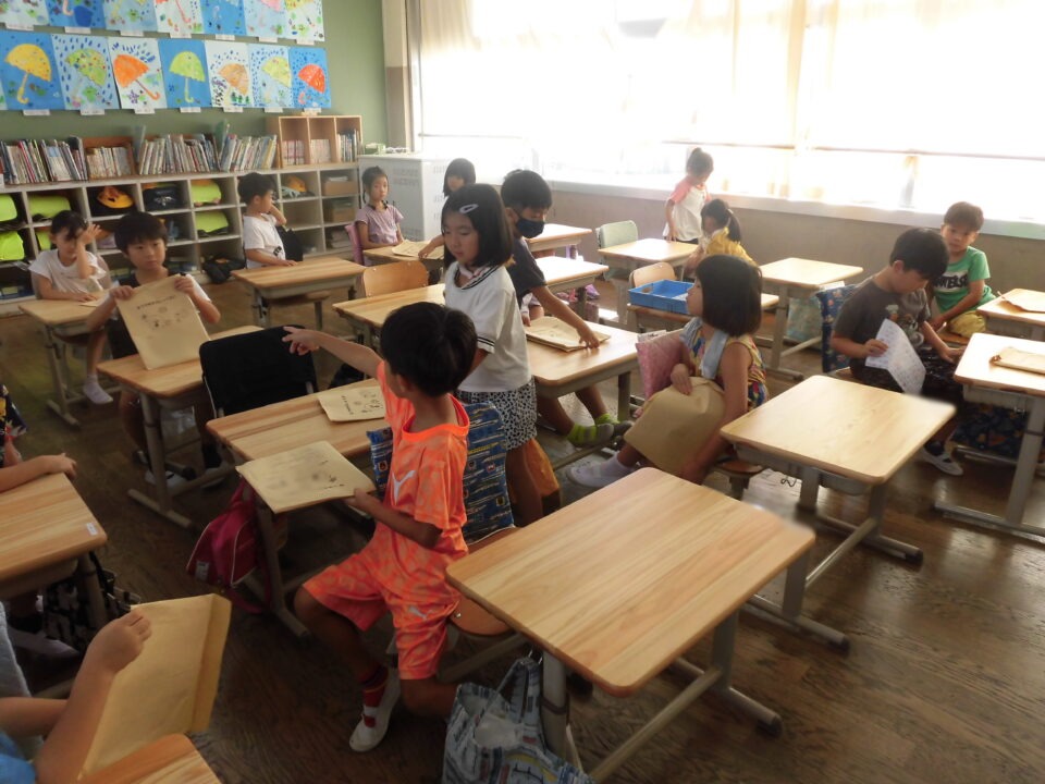 教室では、宿題や習字や絵の作品を担任の先生に提出していたり、さっそく確認テストをしたり、午前中半日とはいえ、クラスで久しぶりに会った友だちと一緒にまた今日から学校で学習モードに切り替えです。