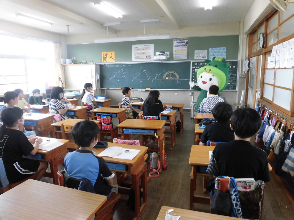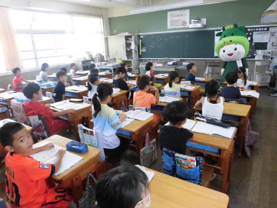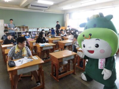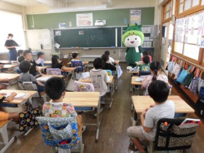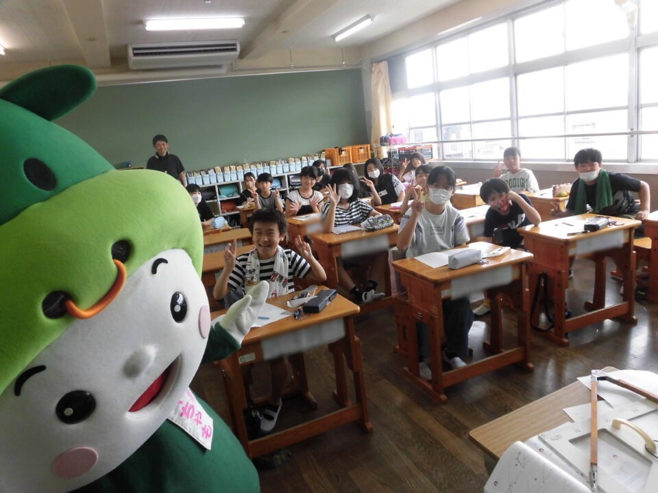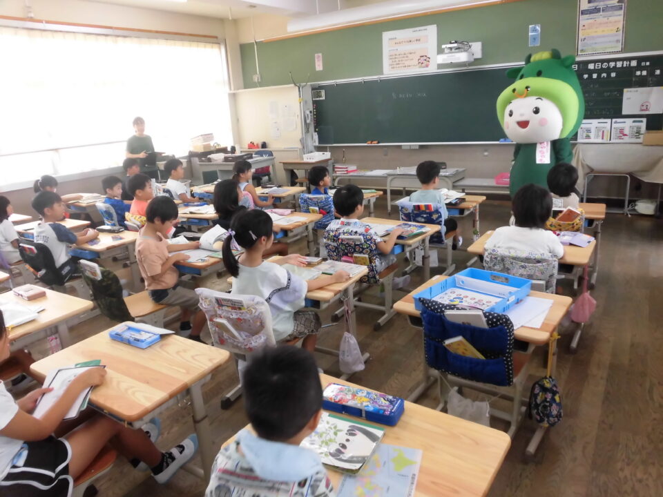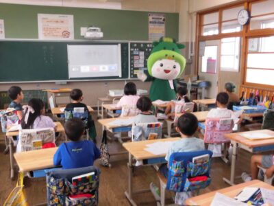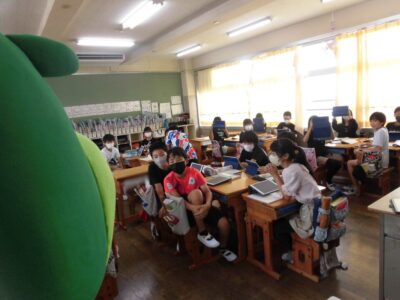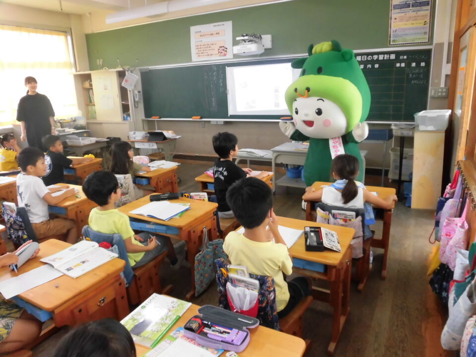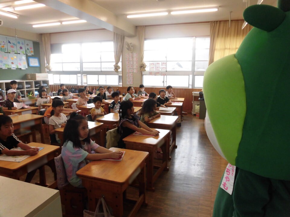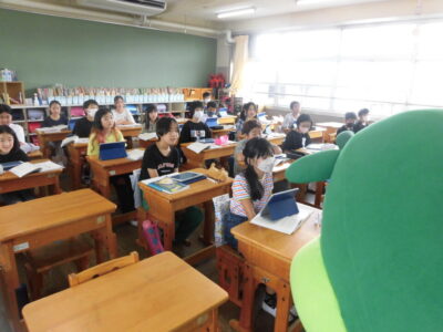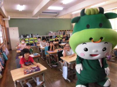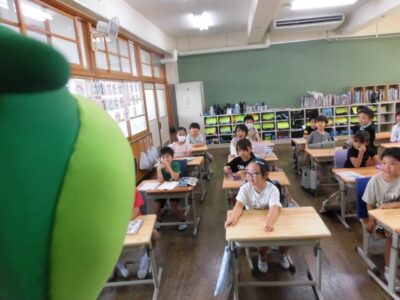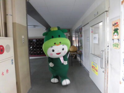今日は、学校が始まりみんな暑い中がんばっているので、松阪市のマスコットキャラクター”ちゃちゃも”が応援に第四小学校に来てくれました。