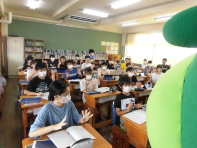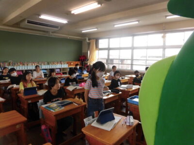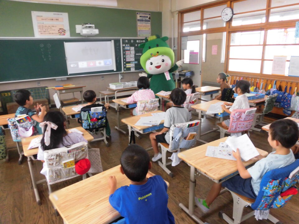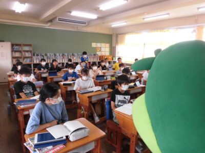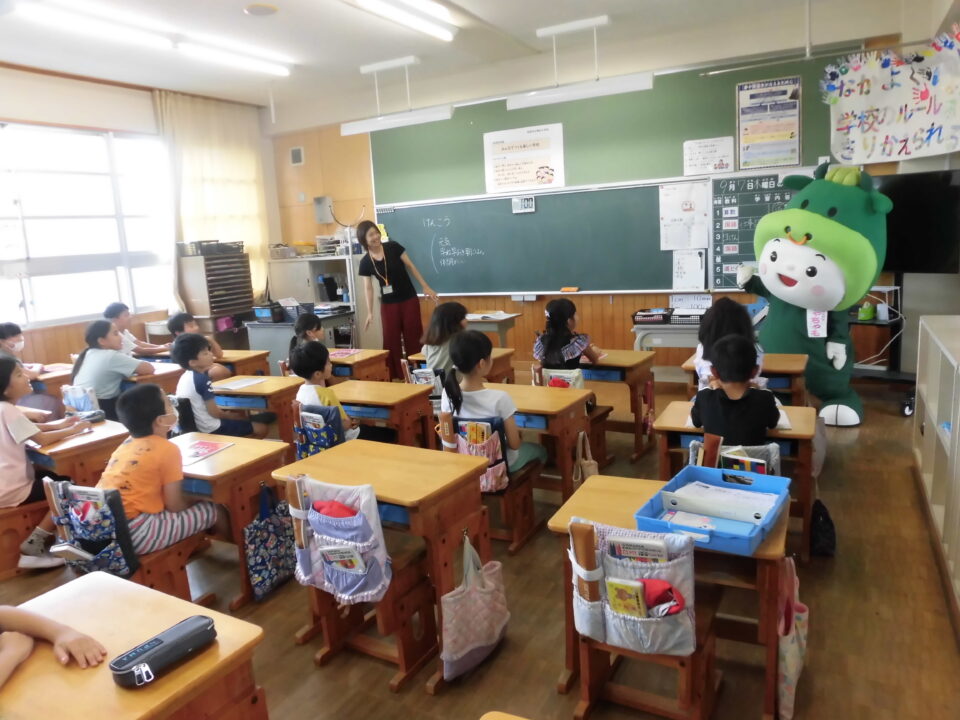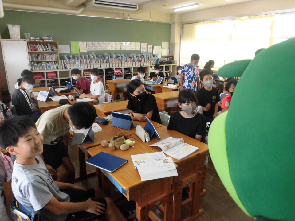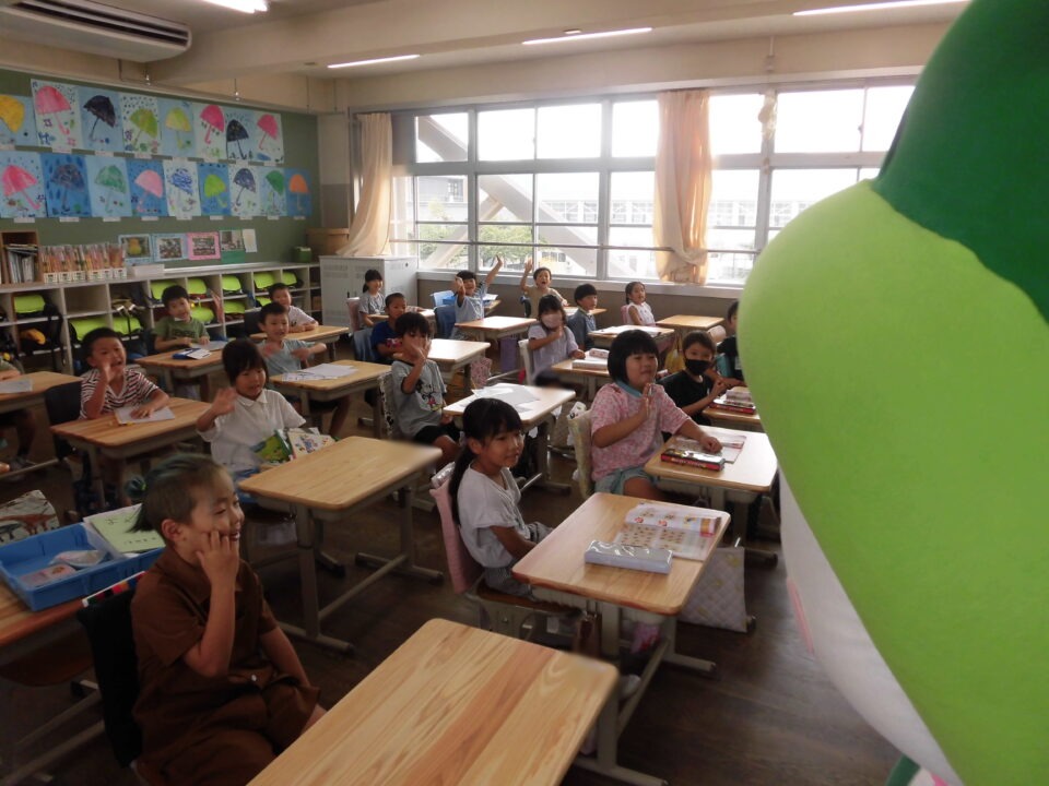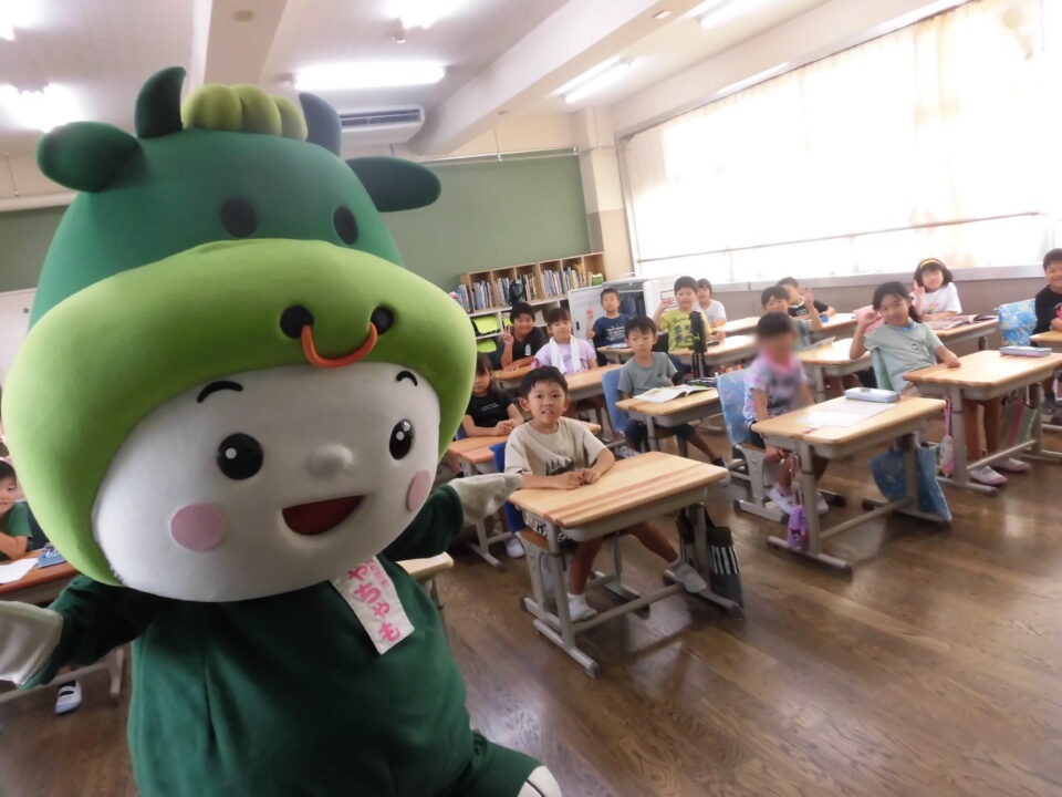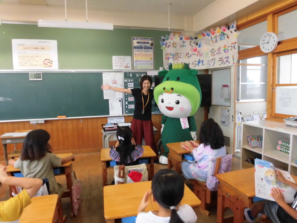 今日は、学校が始まりみんな暑い中がんばっているので、松阪市のマスコットキャラクター”ちゃちゃも”が応援に第四小学校に来てくれました。
