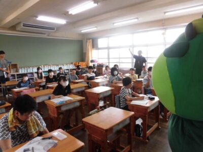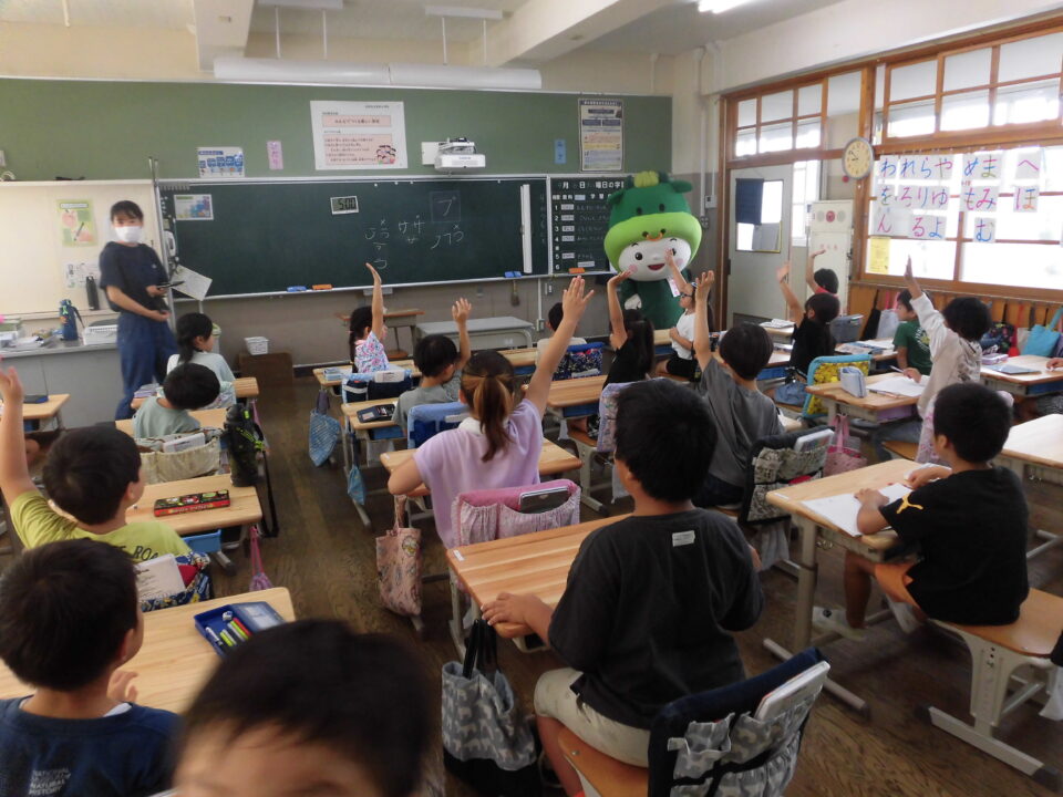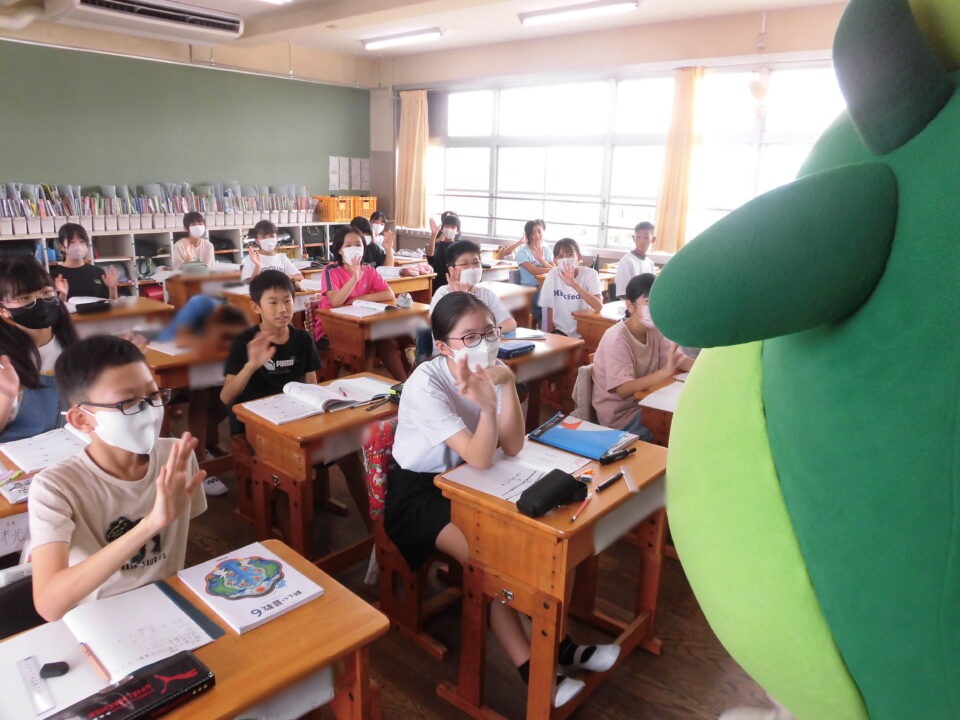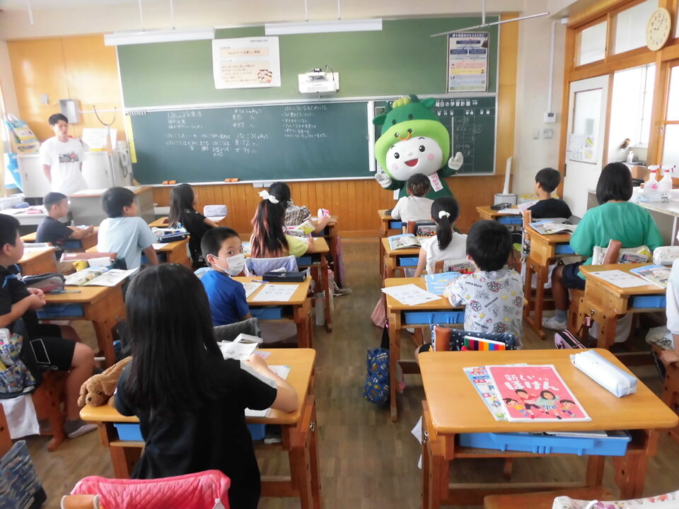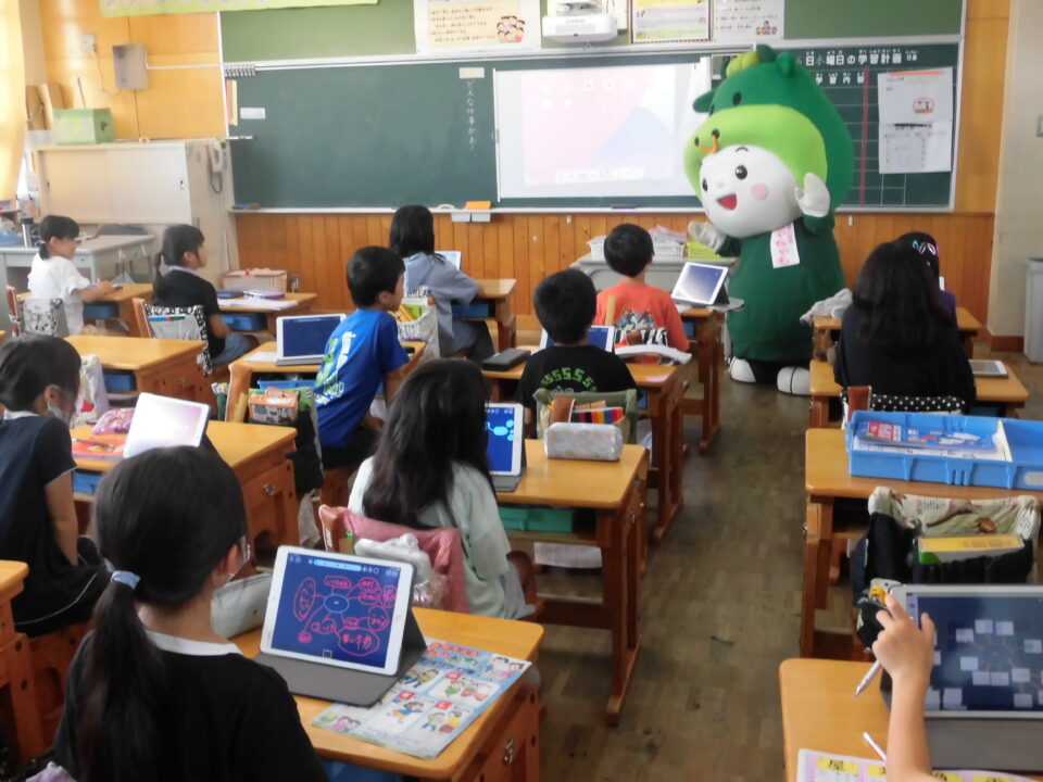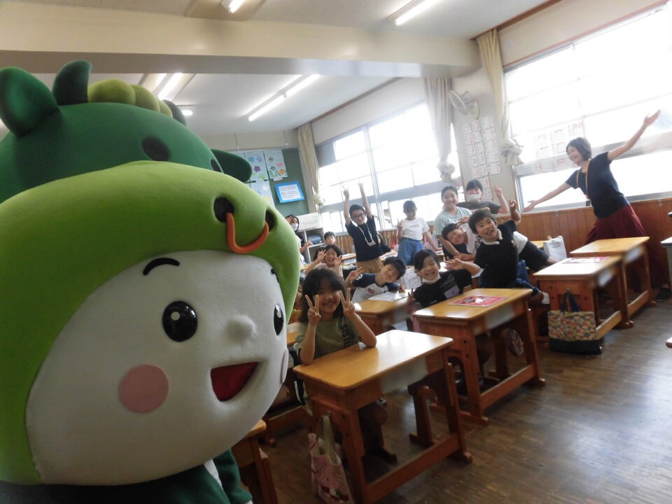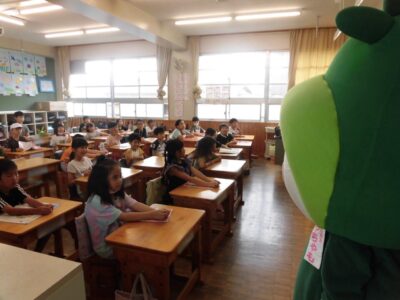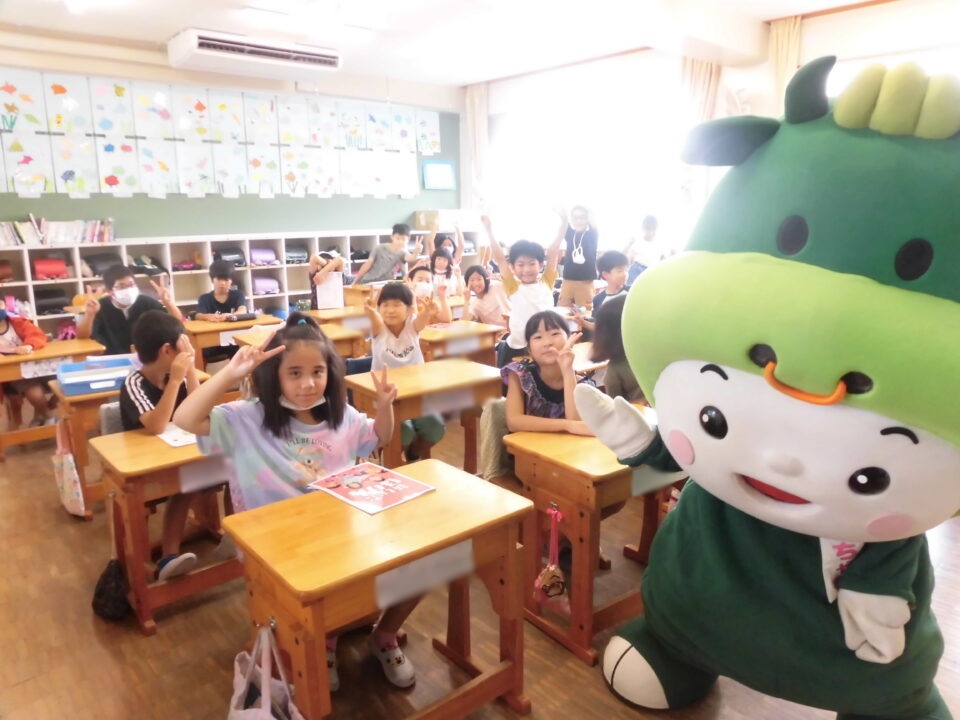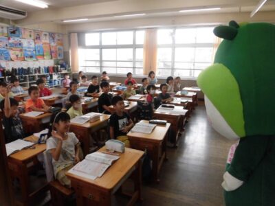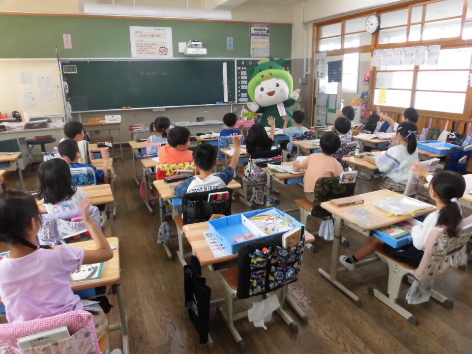 今日は、学校が始まりみんな暑い中がんばっているので、松阪市のマスコットキャラクター”ちゃちゃも”が応援に第四小学校に来てくれました。