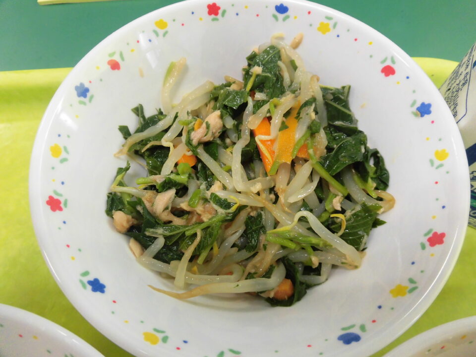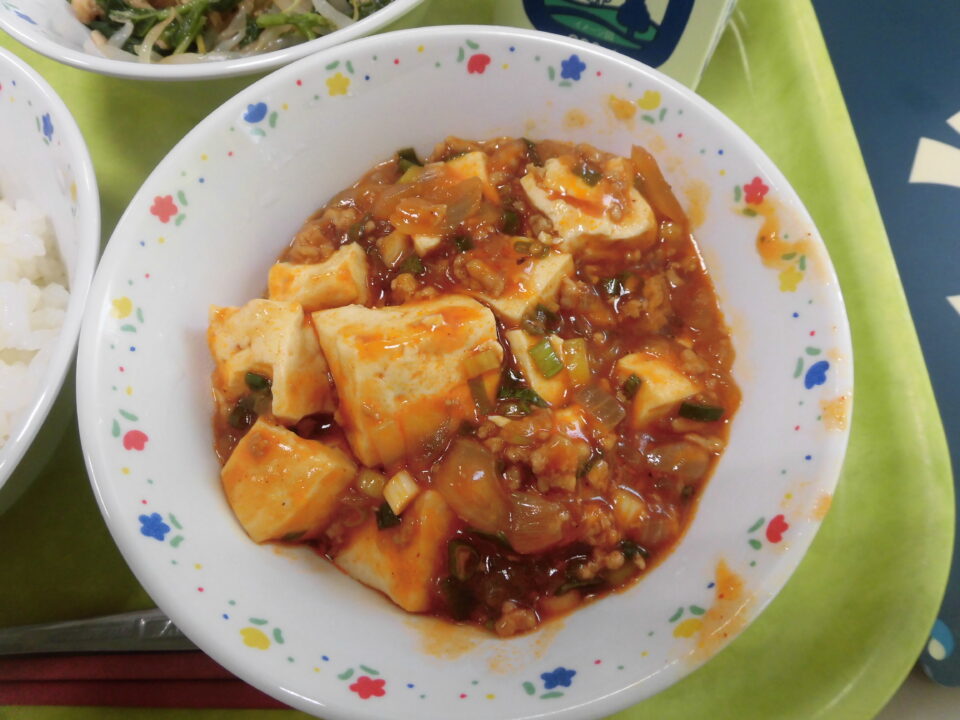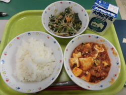 ご飯、牛乳、豆腐のチリソース煮、モロヘイヤのツナ和えです。豆腐は、松阪産大豆から作られています。そしてモロヘイヤも松阪産でしたよ。