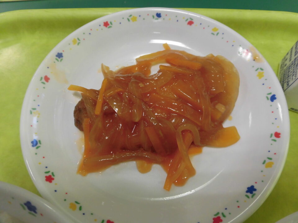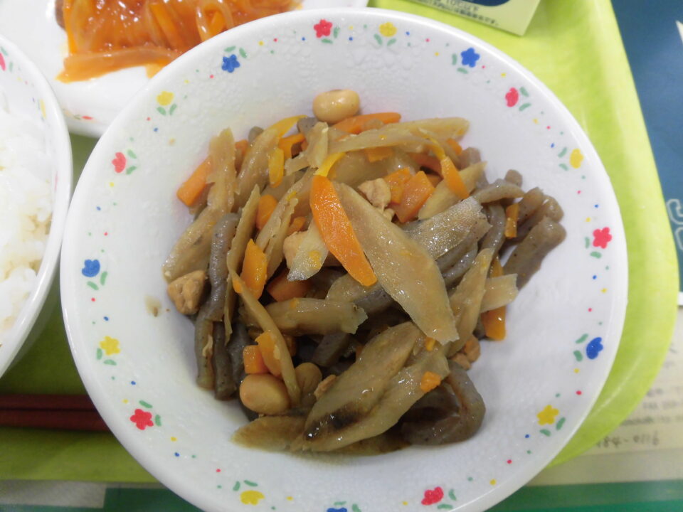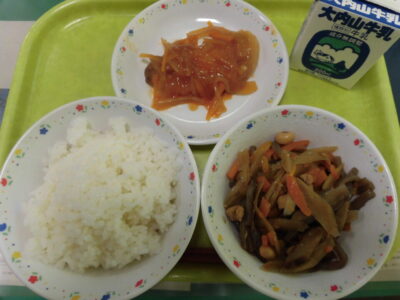 今日の給食は、ご飯、牛乳、あじの甘酢あんかけ、五目きんぴらでした。