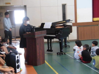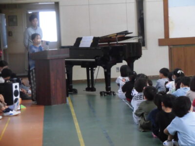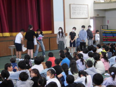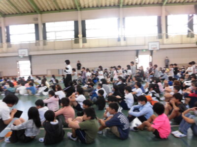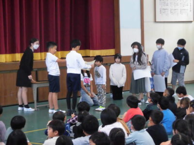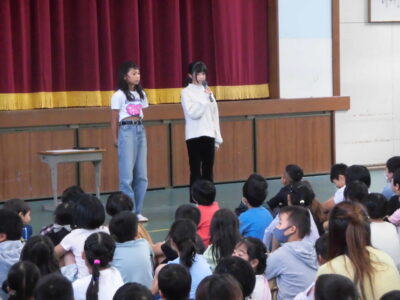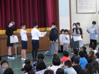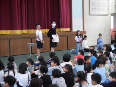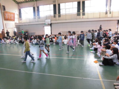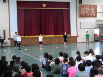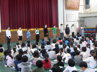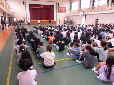 4限めに全校児童が体育館に集まって、にっこり集会がありました。