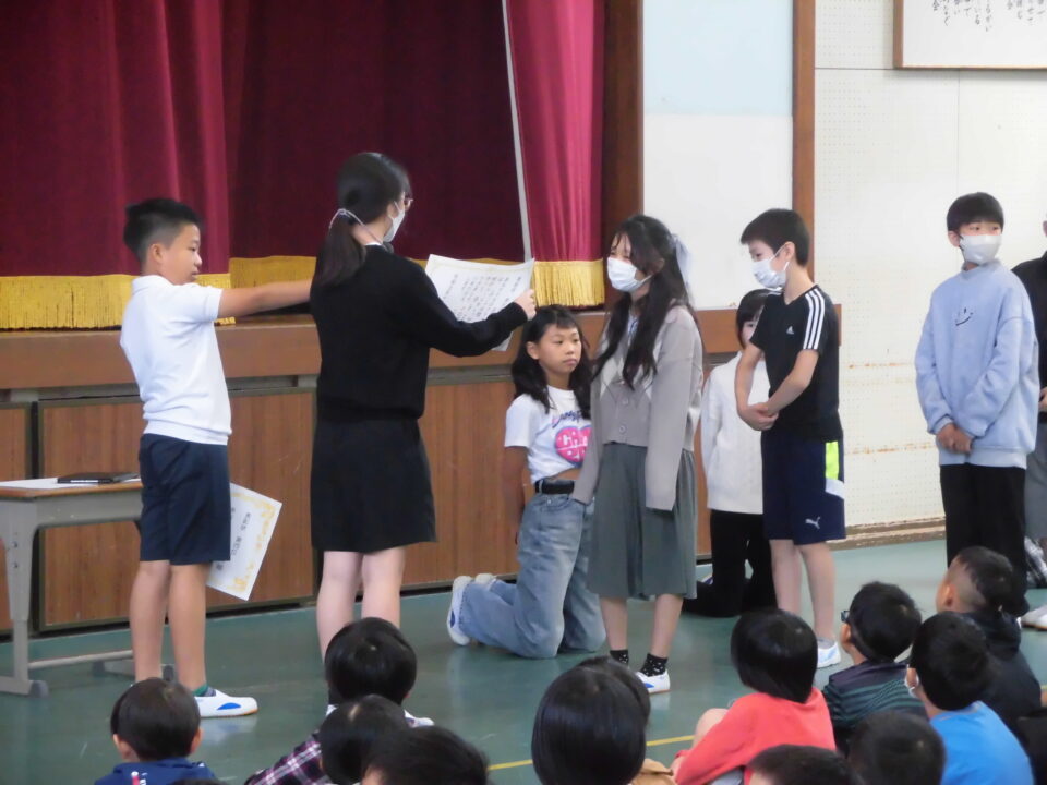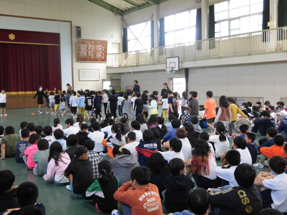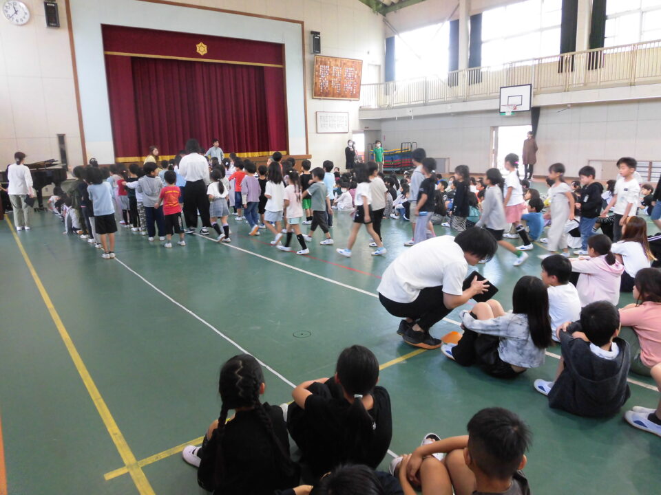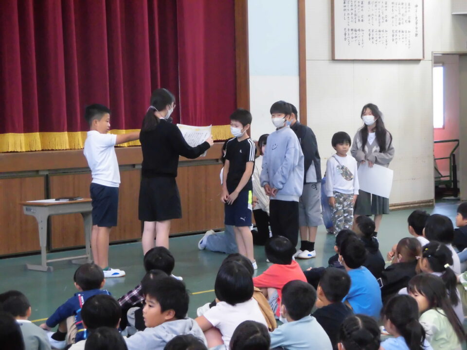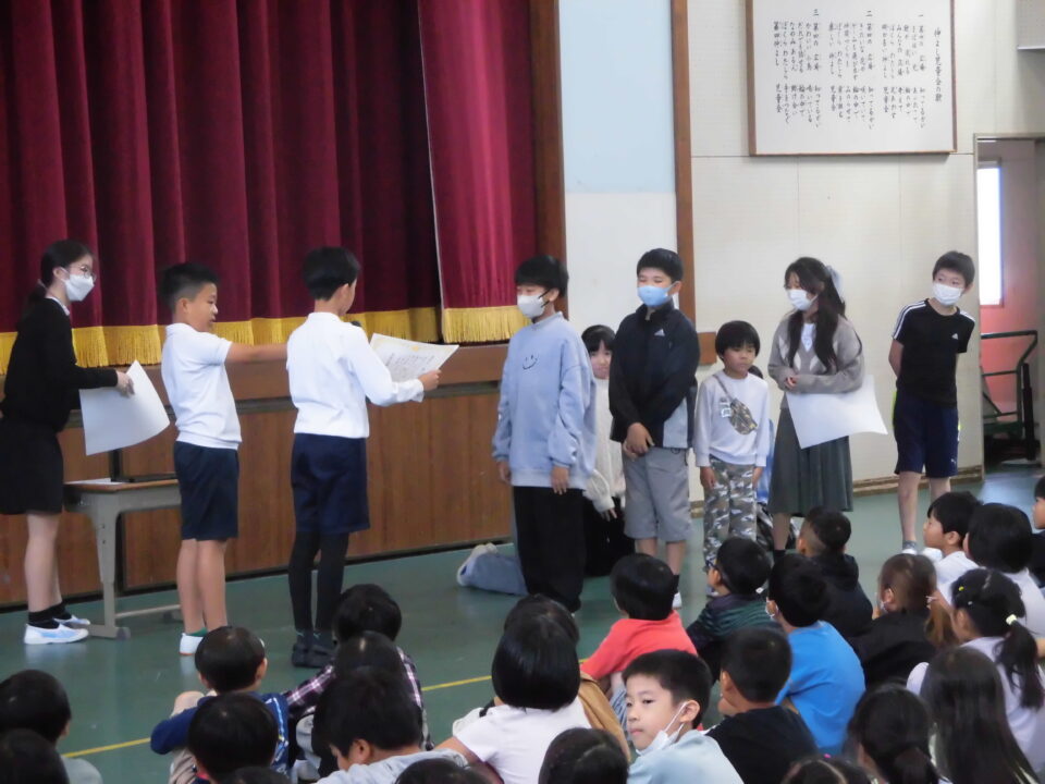4限めに全校児童が体育館に集まって、にっこり集会がありました。