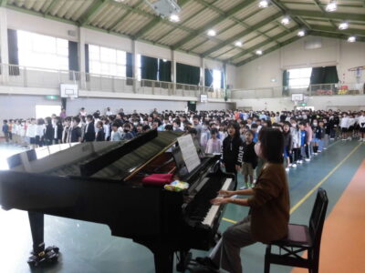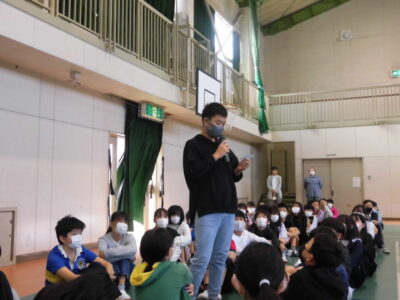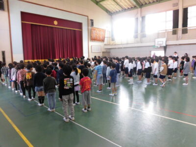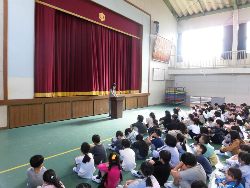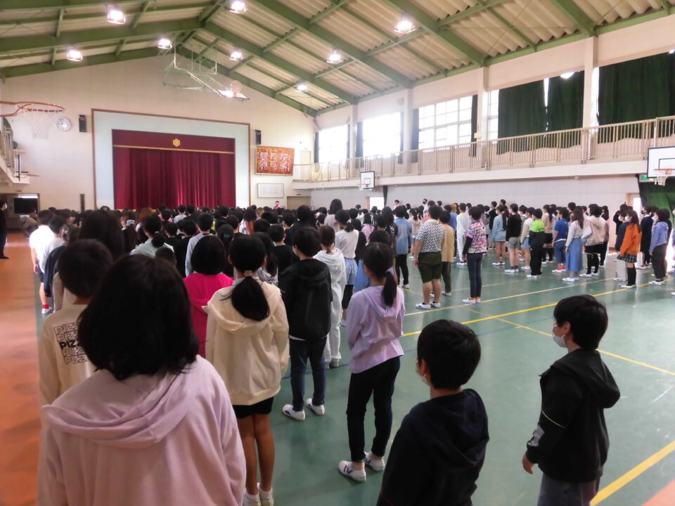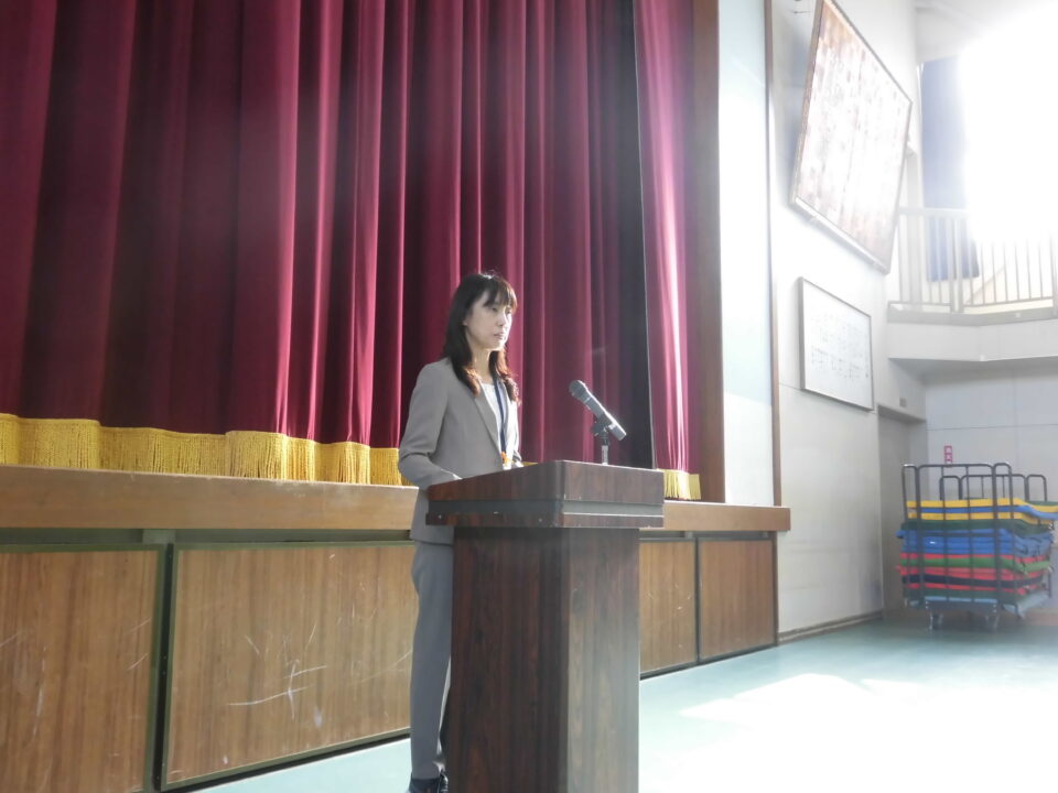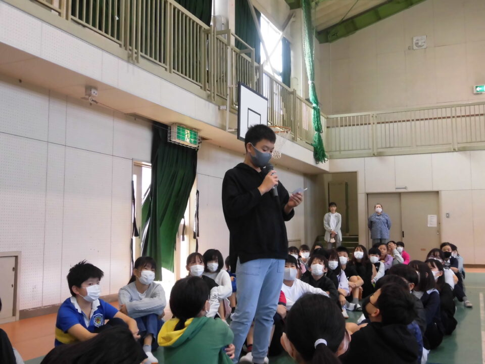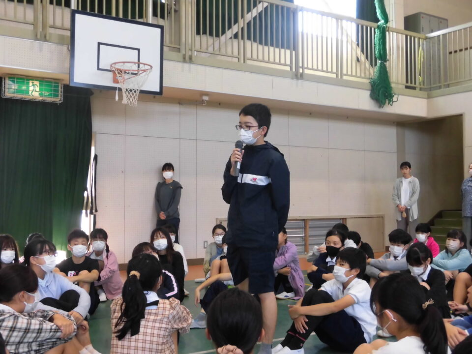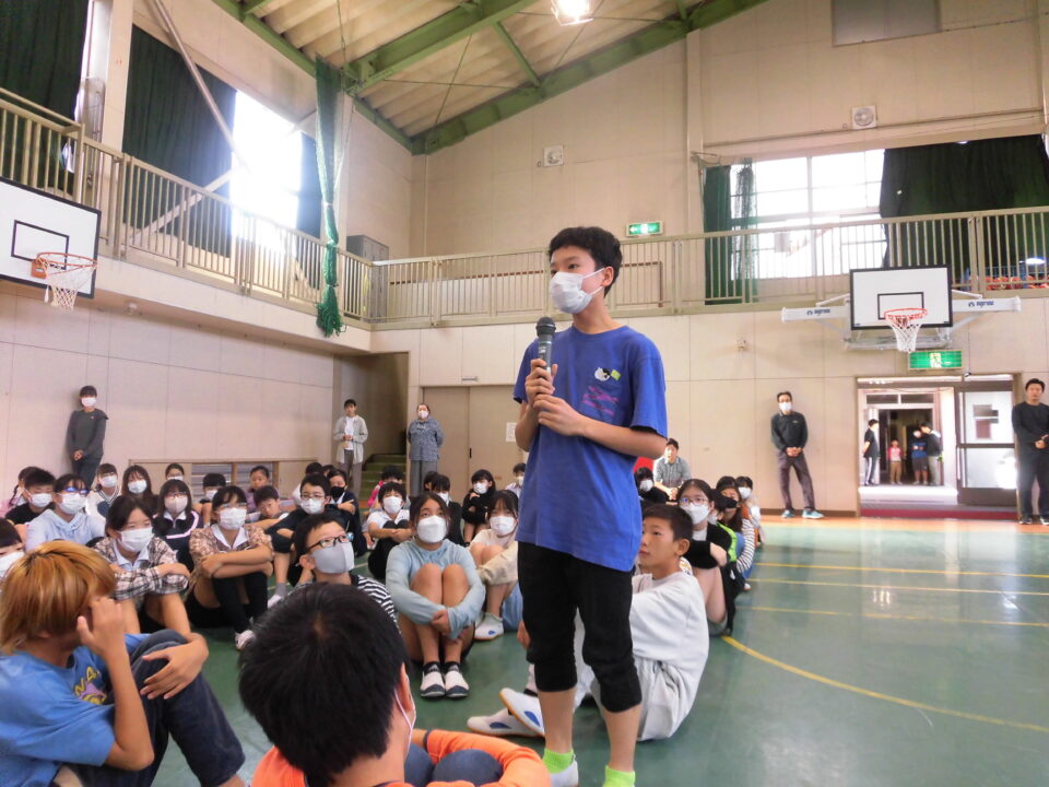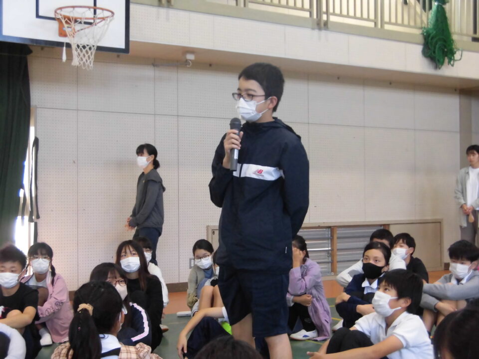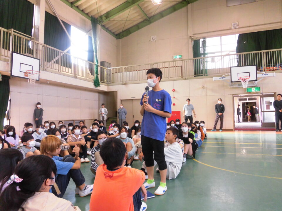 前期終業式では、3人の6年生の人が振り返りをしてくれましたが、今日も6年生の代表3人が後期に向けてのがんばりを話してくれました。