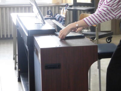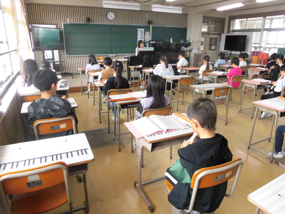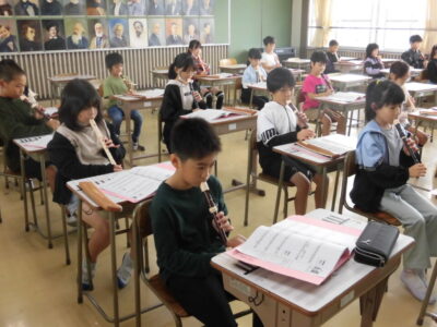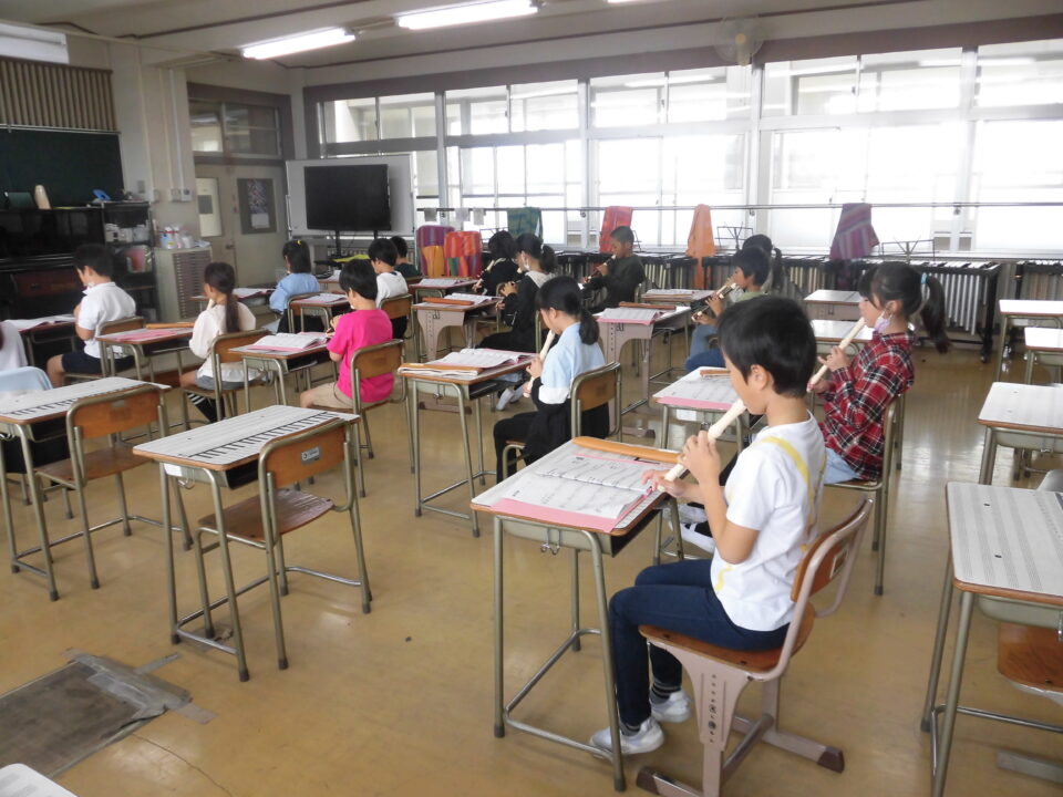 音楽でリコーダーの学習をしているクラスでは、タブレットで演奏を録音し、きれいな音色で奏でられているか聞き合っていました。