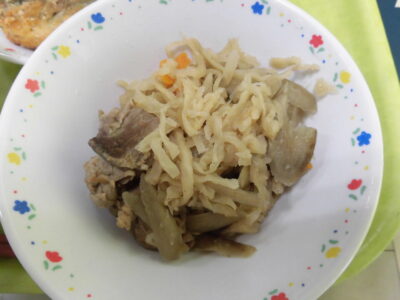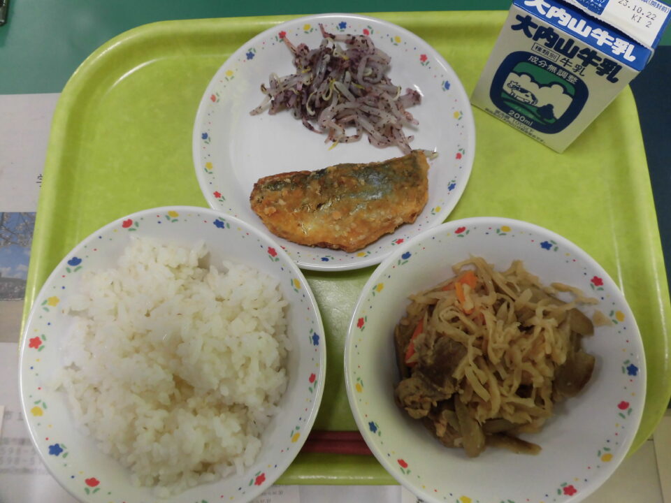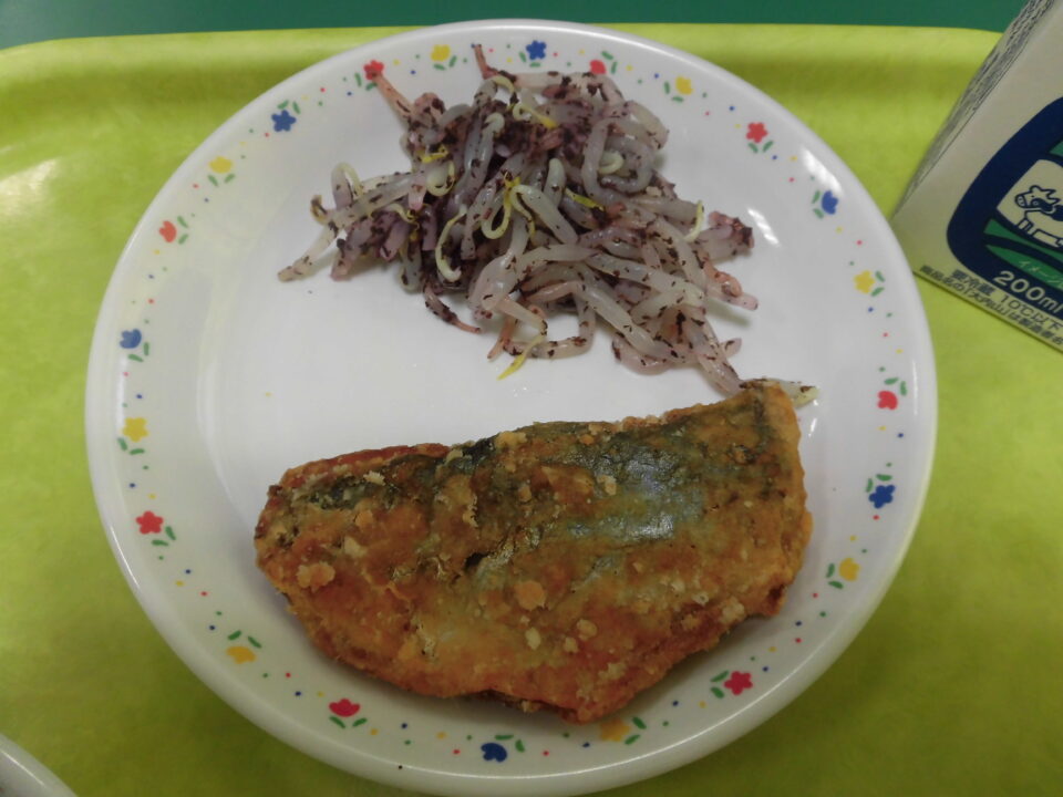 今日の給食は、ご飯(麦入り)、牛乳、あじのから揚げ、もやしのしそ和え、切干大根とごぼうの含め煮でした。
