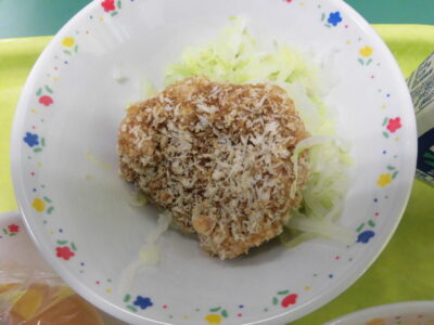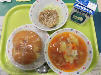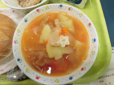 今日の給食は、丸パン(横切り)、豚肉のアングレース、キャベツ、牛乳、ミネストローネでした。