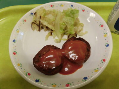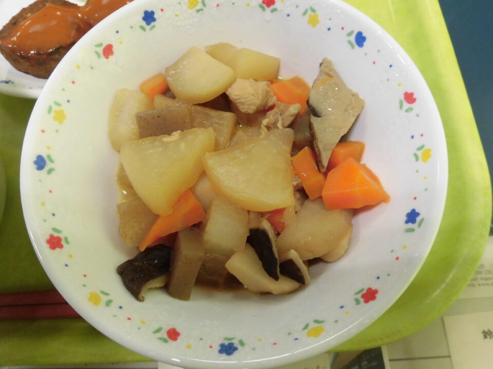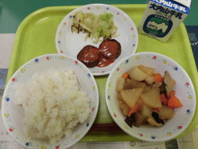 今日の給食は、ご飯(麦入り)、牛乳、まあじバーグのお好み風、キャベツの塩昆布和え、大根と里芋の煮物でした。
