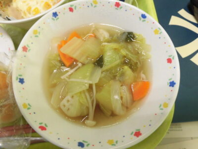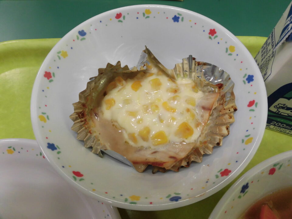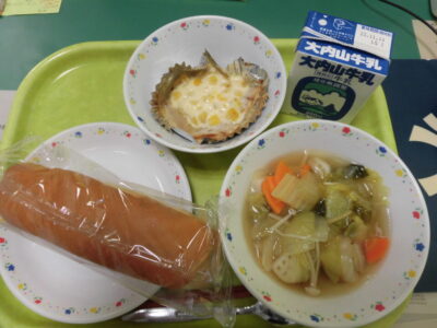 今日の給食は、米粉入りパン、牛乳、しいらの粒コーン焼き、秋の具だくさんスープでした。