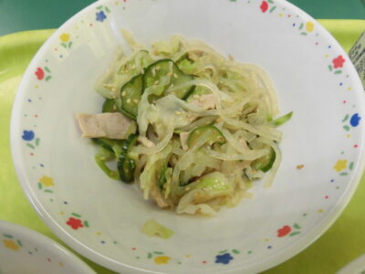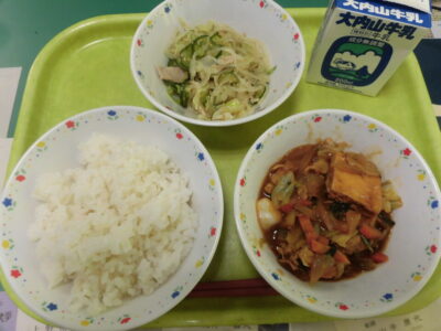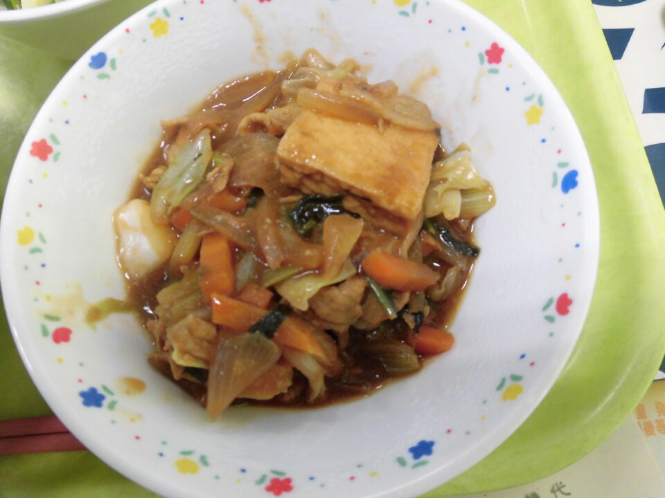今日きょう給食きゅうしょくは、ごはん麦入むぎいり)、牛乳ぎゅうにゅう厚揚あつあげと豚肉ぶたにくのピリ辛炒からいため、バンサンスーでした。