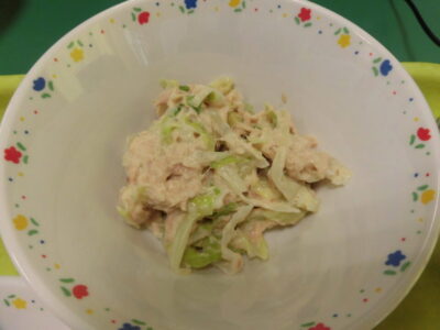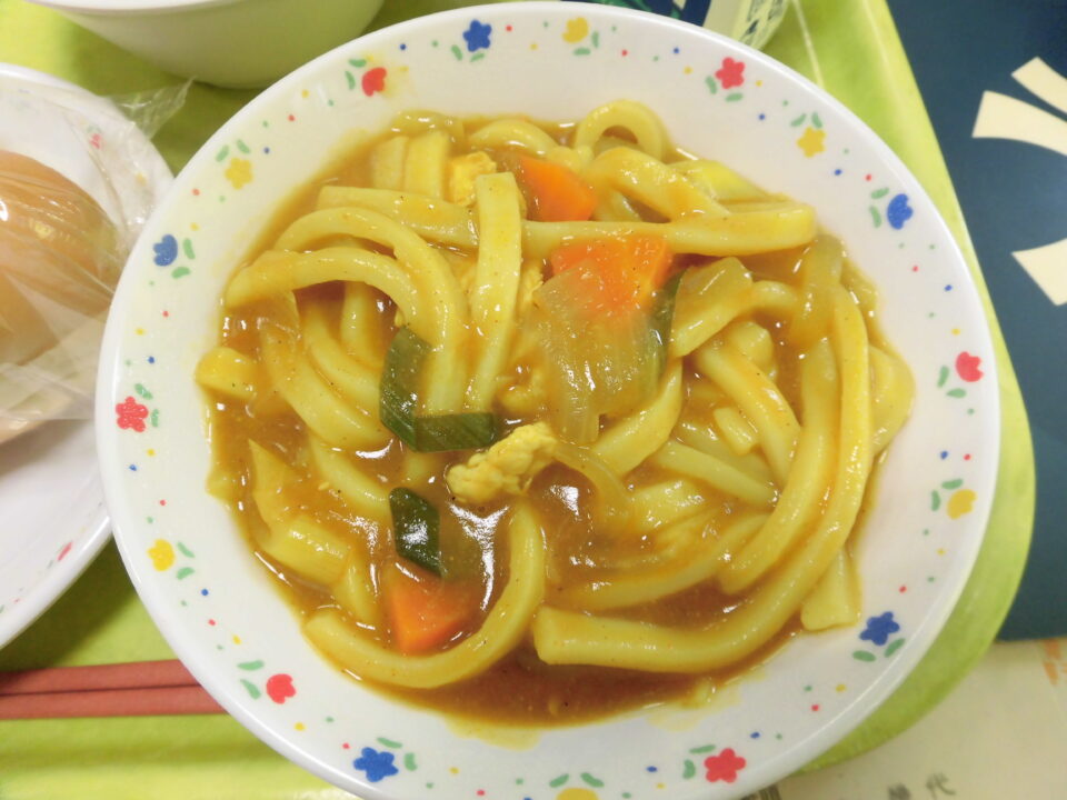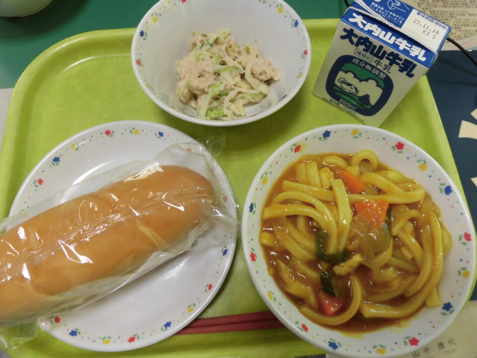 今日の給食は、小型コッペパン(横切り)、ツナとキャベツのサラダ、牛乳、カレーうどんでした。