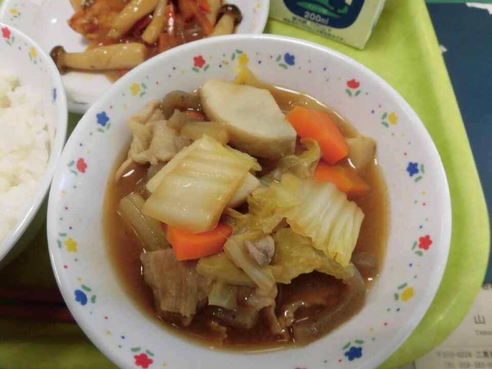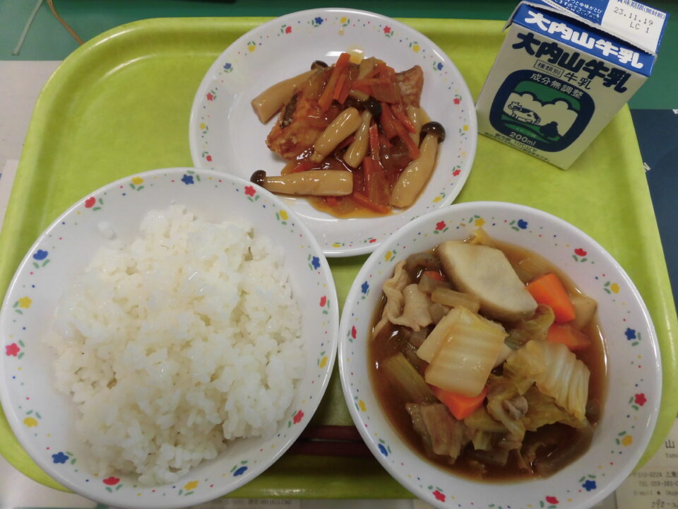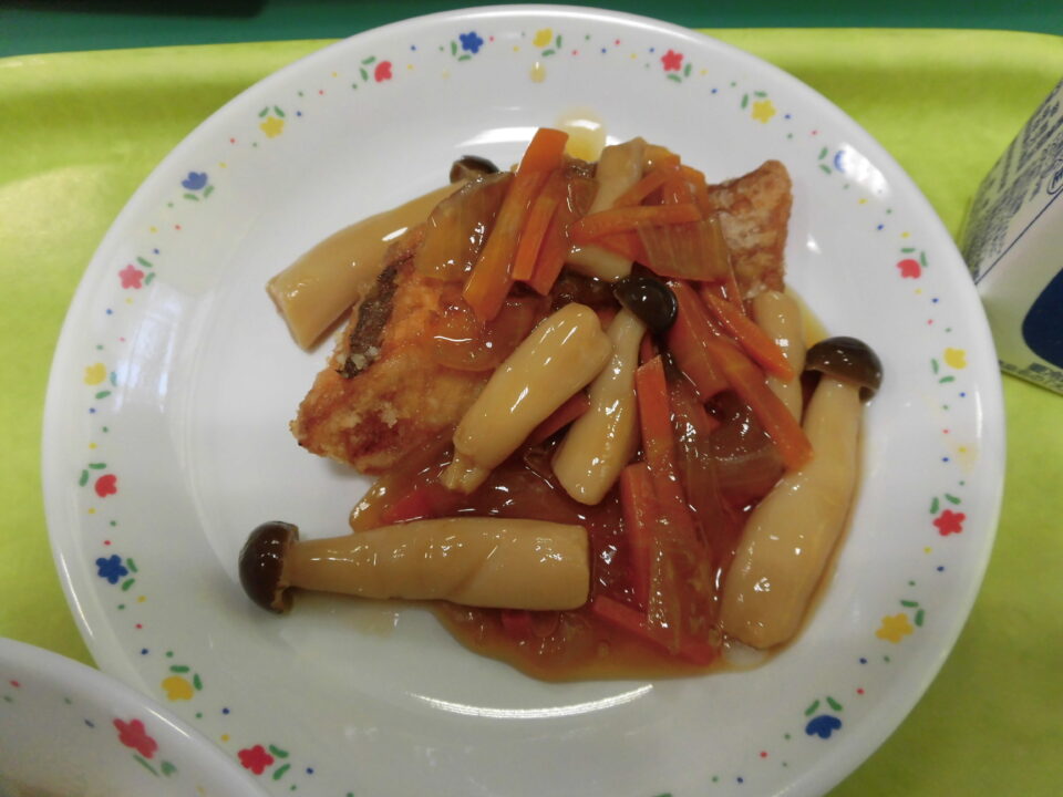 今日きょう給食きゅうしょくは、ごはん牛乳ぎゅうにゅう、さけのきのこあんかけ、庄内風しょうないふういもでした。