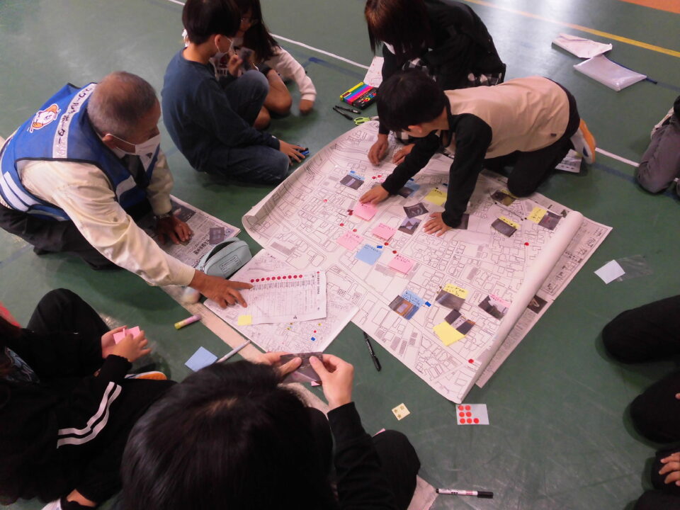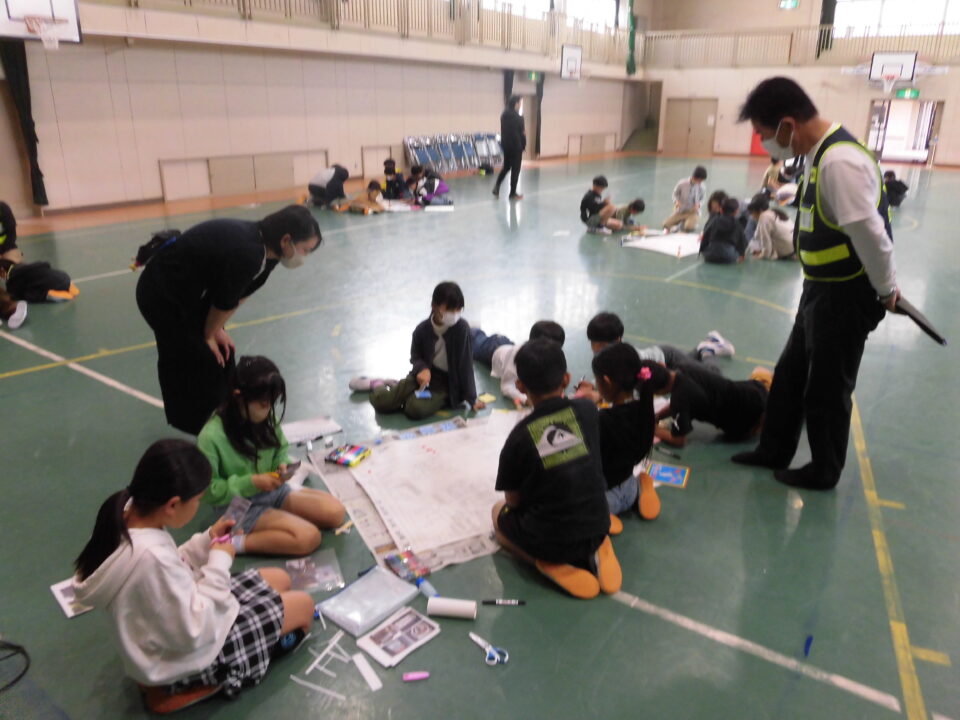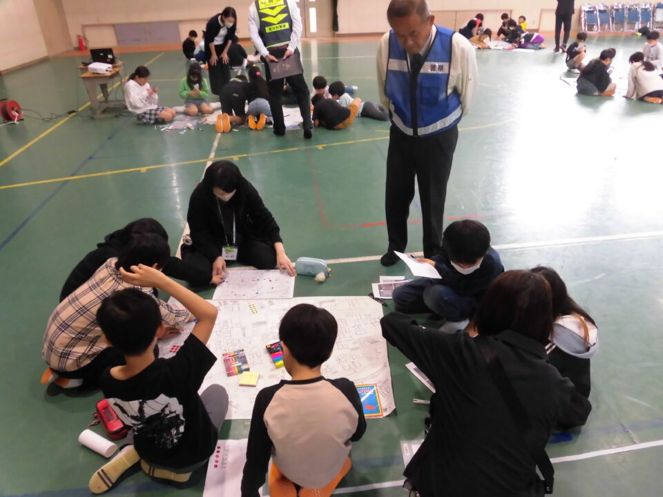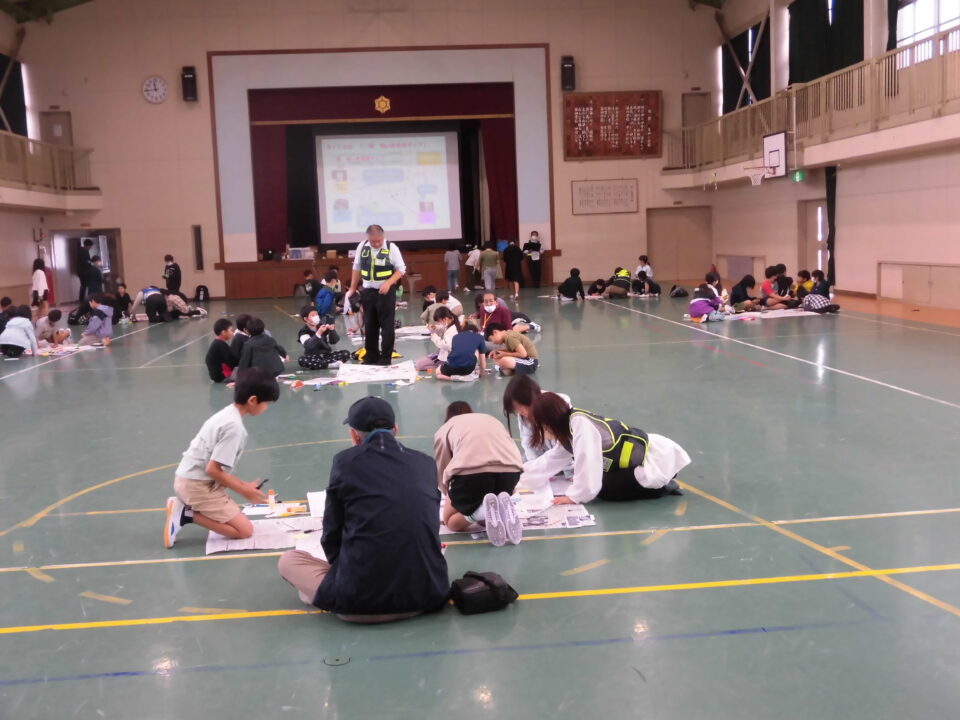 4年生は、10時30分ごろ学校へ帰ってきて、引き続き、松阪市の防災対策課、地域安全対策課の方や保護者の方、CSボランティアの方と一緒に安全マップづくりをしました。