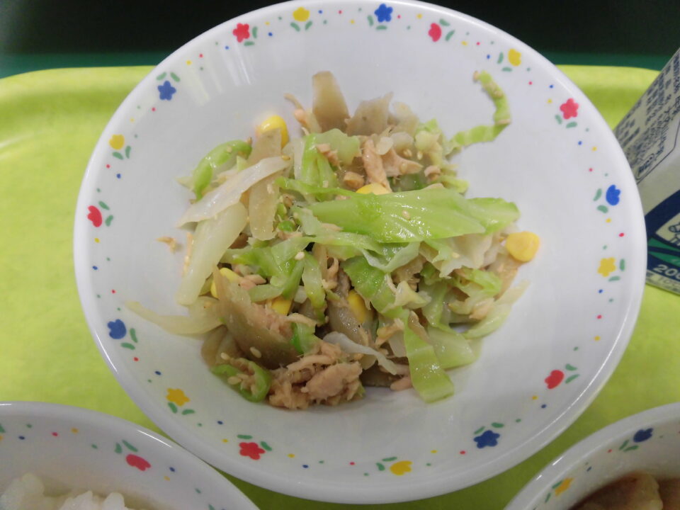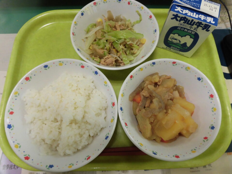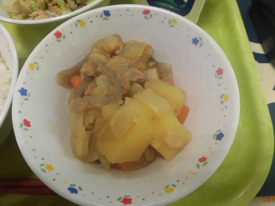 今日の給食は、ご飯、牛乳、じゃがいものうま煮、ごぼうの和風サラダでした。