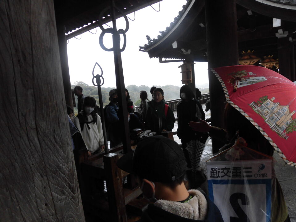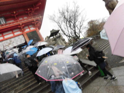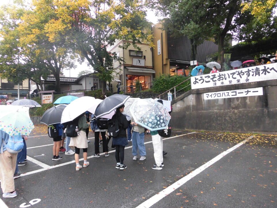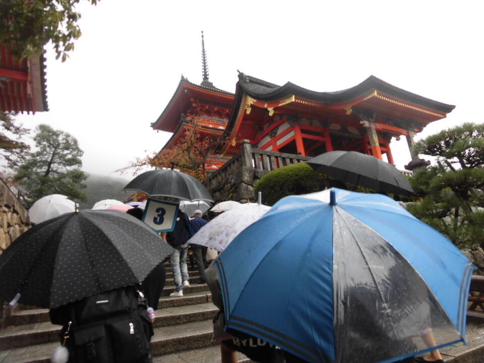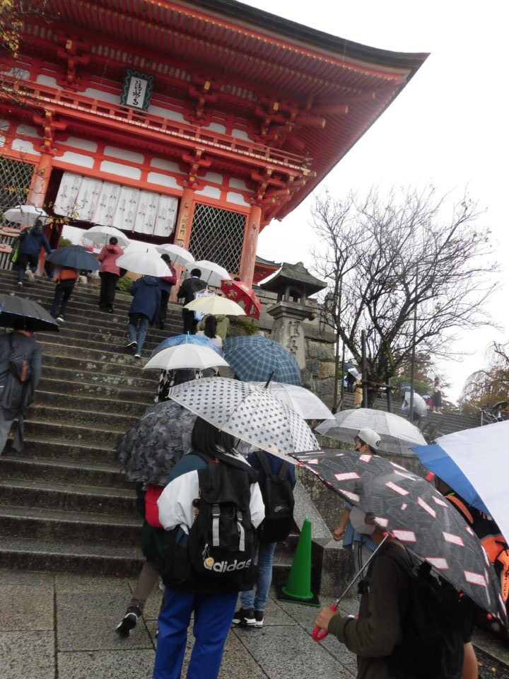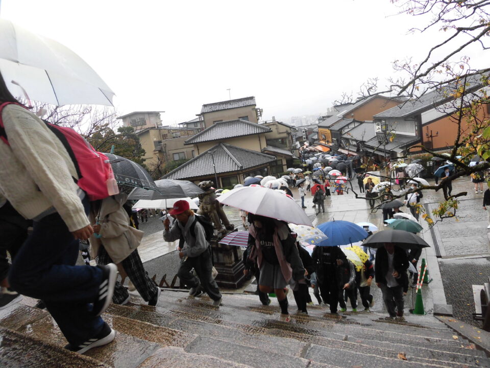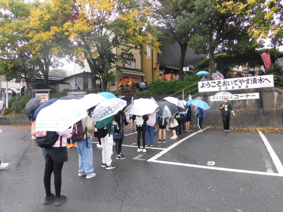 清水寺の駐車場に着くと、観光や修学旅行の人などたくさんの人でにぎわっていました。そのうえ小雨がぱらついていてたいへんでした(>_<)